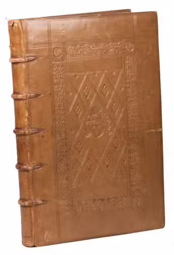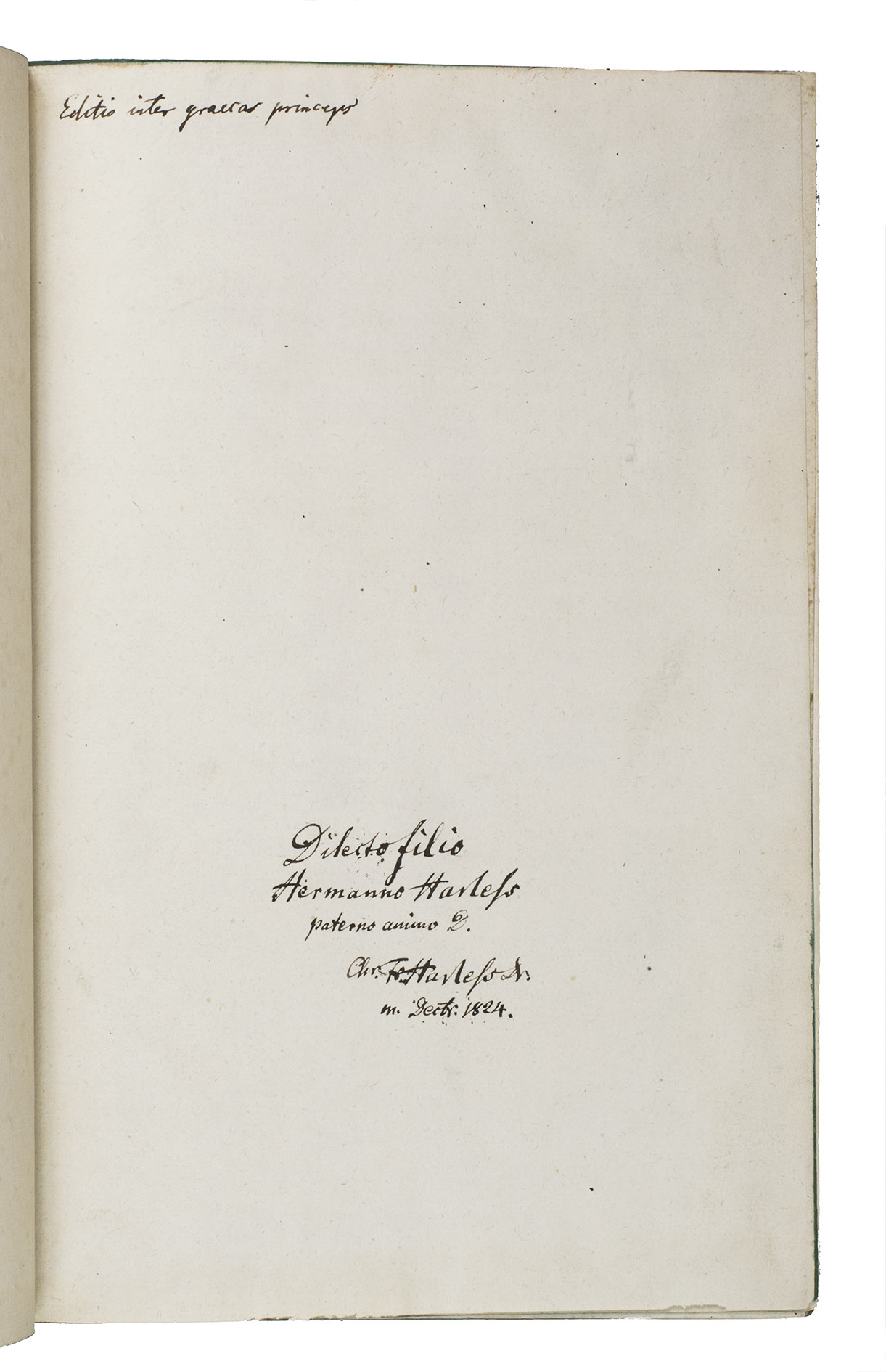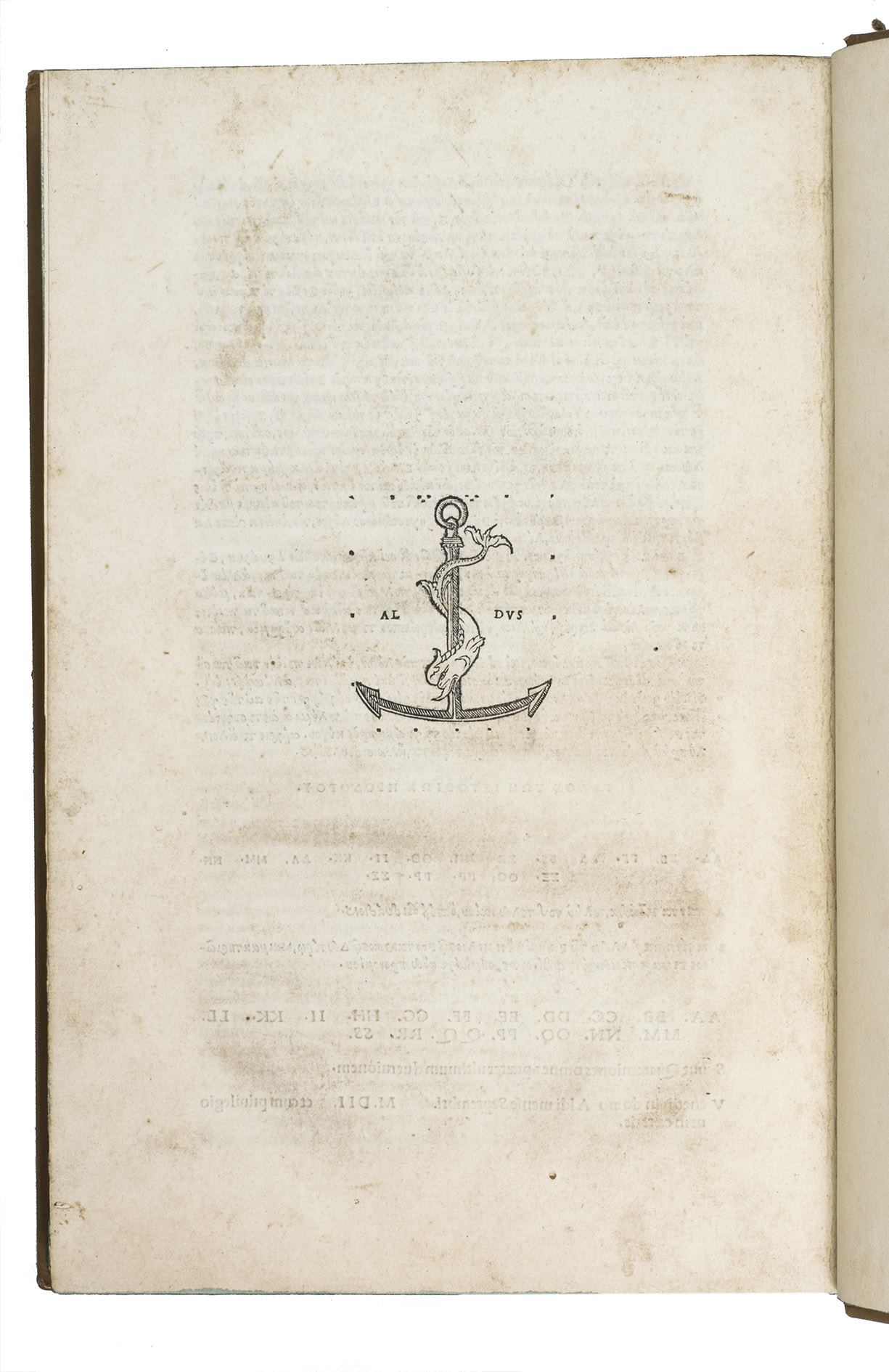 (Colophon: Venice), Aldus Manutius, (colophon: September 1502). Folio (29.5 x 20 cm). With Aldus's anchor and dolphin device on the title page and the verso of the last leaf. Late 19th-century blind-tooled, polished tan calf, the central panel with the arms of the Dukes of Arenberg. [140] ll.