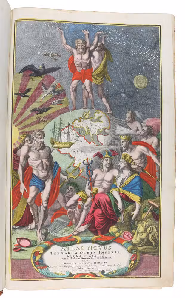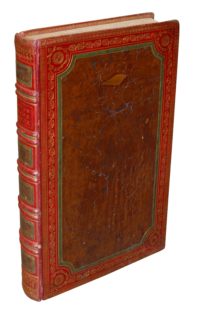 Nuremberg, Homann heirs (printed by Johann Heinrich Gottfried Bieling), 1737[-1762]. Folio (34 x 53.5 cm). Letterpress title-page printed in red and black with an engraved map of the northern hemisphere in a polar projection, engraved frontispiece with a globe and a dozen allegorical figures (with a decorated cartouche at the foot giving the title in Latin), engraved portrait of Homann by Johann Wilhelm Winter after Johannes Kenckel, and 98 engraved maps (93 double-page, 1 larger folding in 2 sheets and 4 half-page together on a double-page plate) many with further inset maps and/or views, all with decorated cartouches, often with pictorial decoration or coats of arms; and 3 double-page engraved tables of topographic data. With the engraved title-page and all maps and tables (except for the small north polar projection on the letterpress title-page) coloured by an 18th-century hand, the maps in part or in outline. Gold-tooled red morocco (ca. 1800?) in a neo-classical style, from the workshop of or in the style of Georg Friedrich Krauss (Vienna). [3], [1 blank], 40 pp. plus frontispiece, portrait and 99 double-page plates.