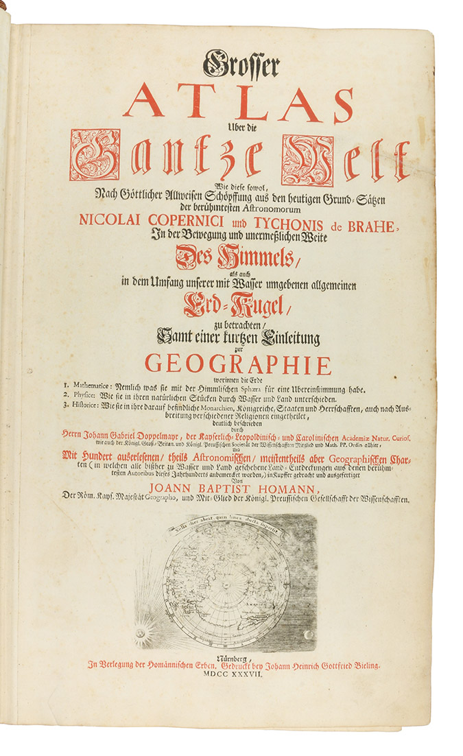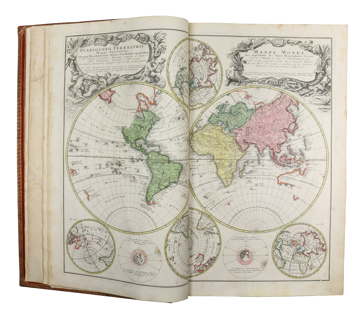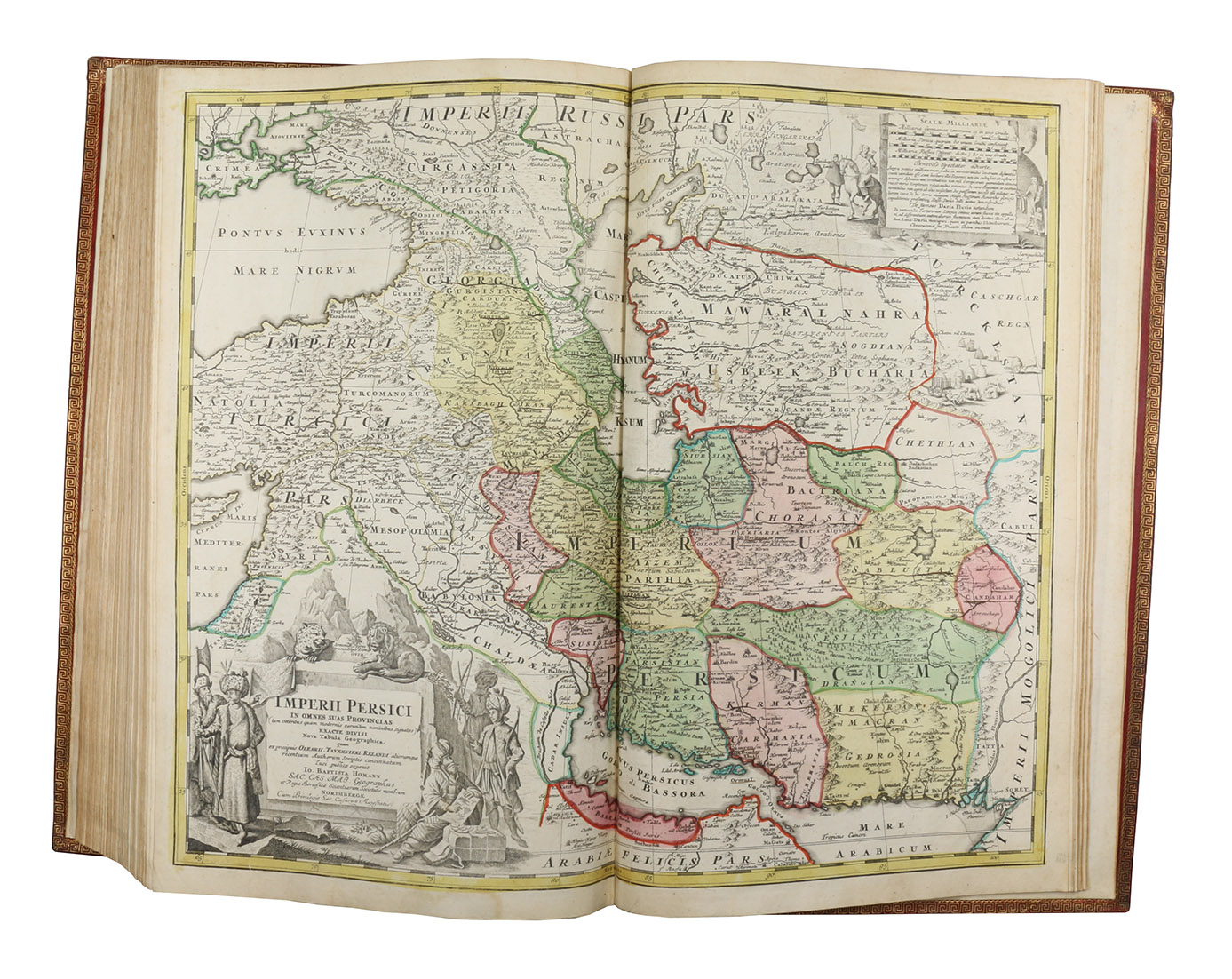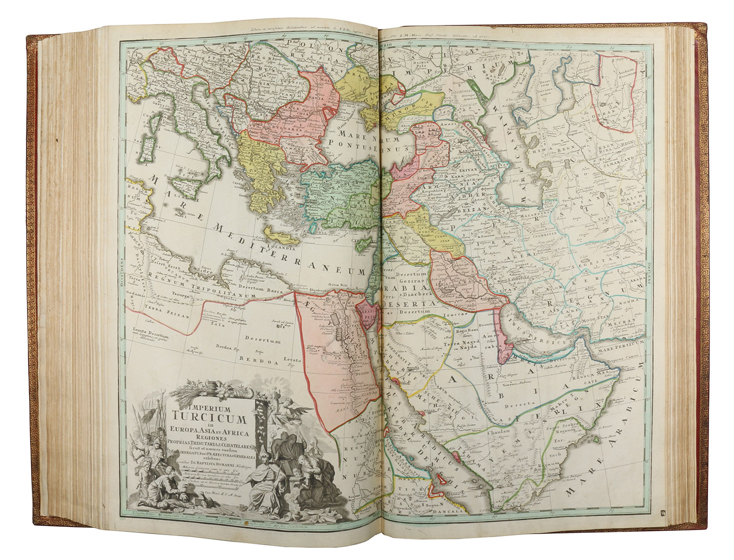 The Lord Wardington copy of the last edition (1737 with later substitutions by the publisher, probably issued ca. 1762) of Germanys most famous 18th-century world atlas in an exceptionally fine binding, commissioned in Vienna around 1800, and with the frontispiece and all maps coloured by an 18th-century hand. After a 40-page introduction and descriptions by Johann Gabriel Doppelmayr, the atlas contains a celestial chart in 2 hemispheres (with pictorial constellations) surrounded by 6 smaller cosmological diagrams; a Copernican solar system; a world map in eastern and western hemispheres plus 4 smaller projections (2 polar and 2 centred on Europe and the South Pacific); the usual maps of the continents and numerous regions in Europe (including postal maps and maps of river valleys); but also maps of the Black Sea and surroundings (including one with the whole of Turkey); Egypt; the Persian (Iranian) Empire; the Ottoman Empire with the Arabian peninsula and the Gulf; China; Mexico, the Caribbean and most of what is now the United States; and 4 half-page maps of British colonies in America (together on a double-page plate).
