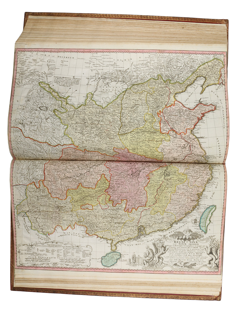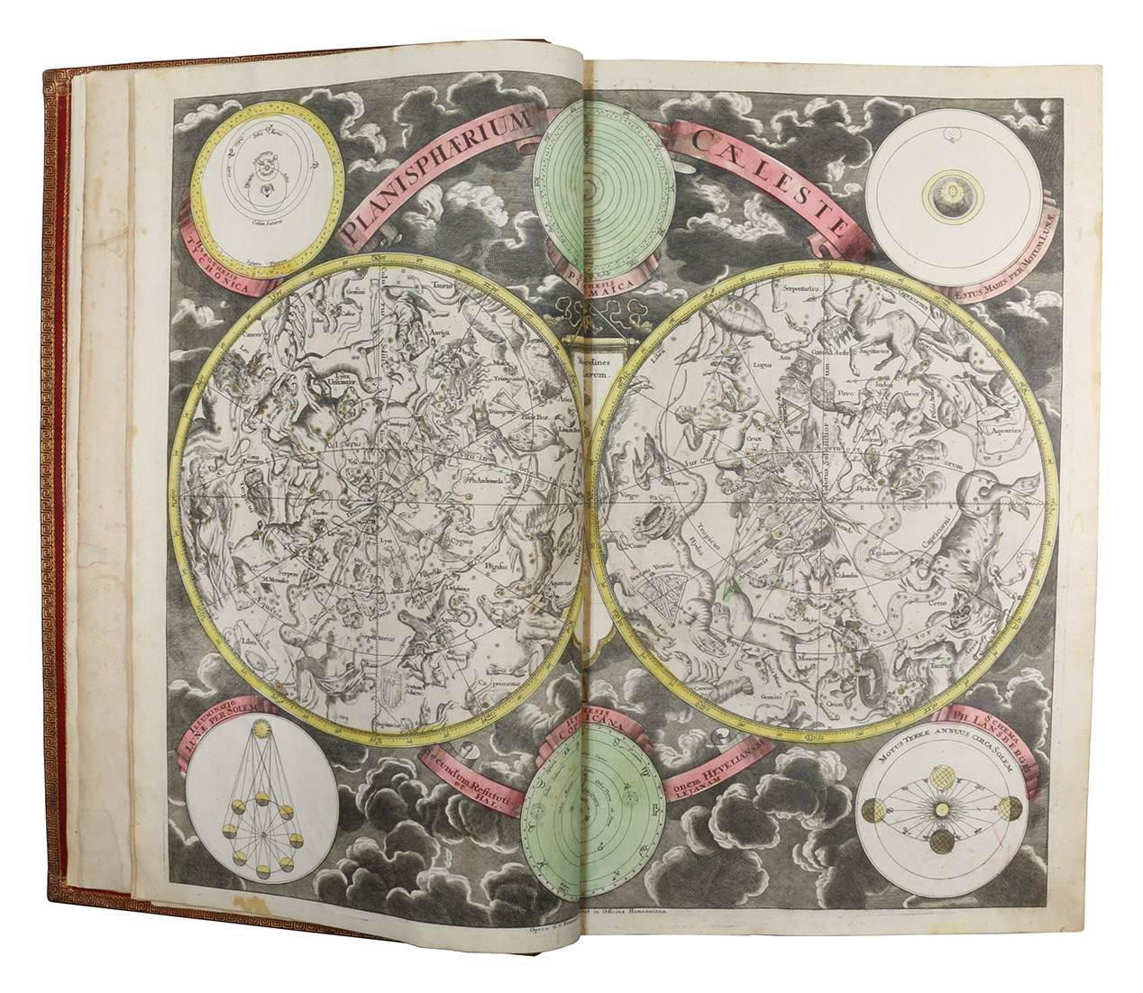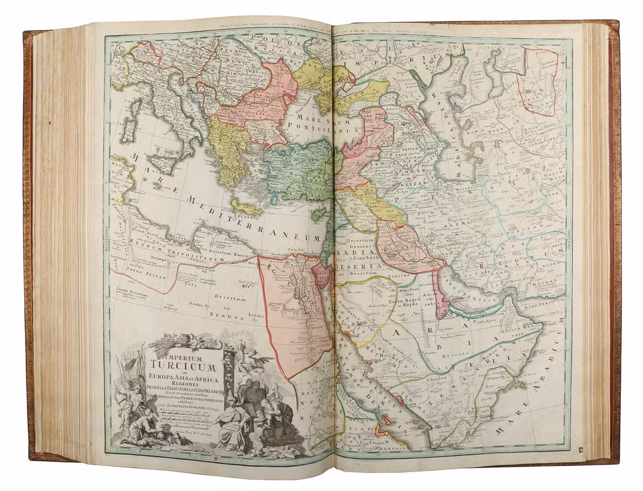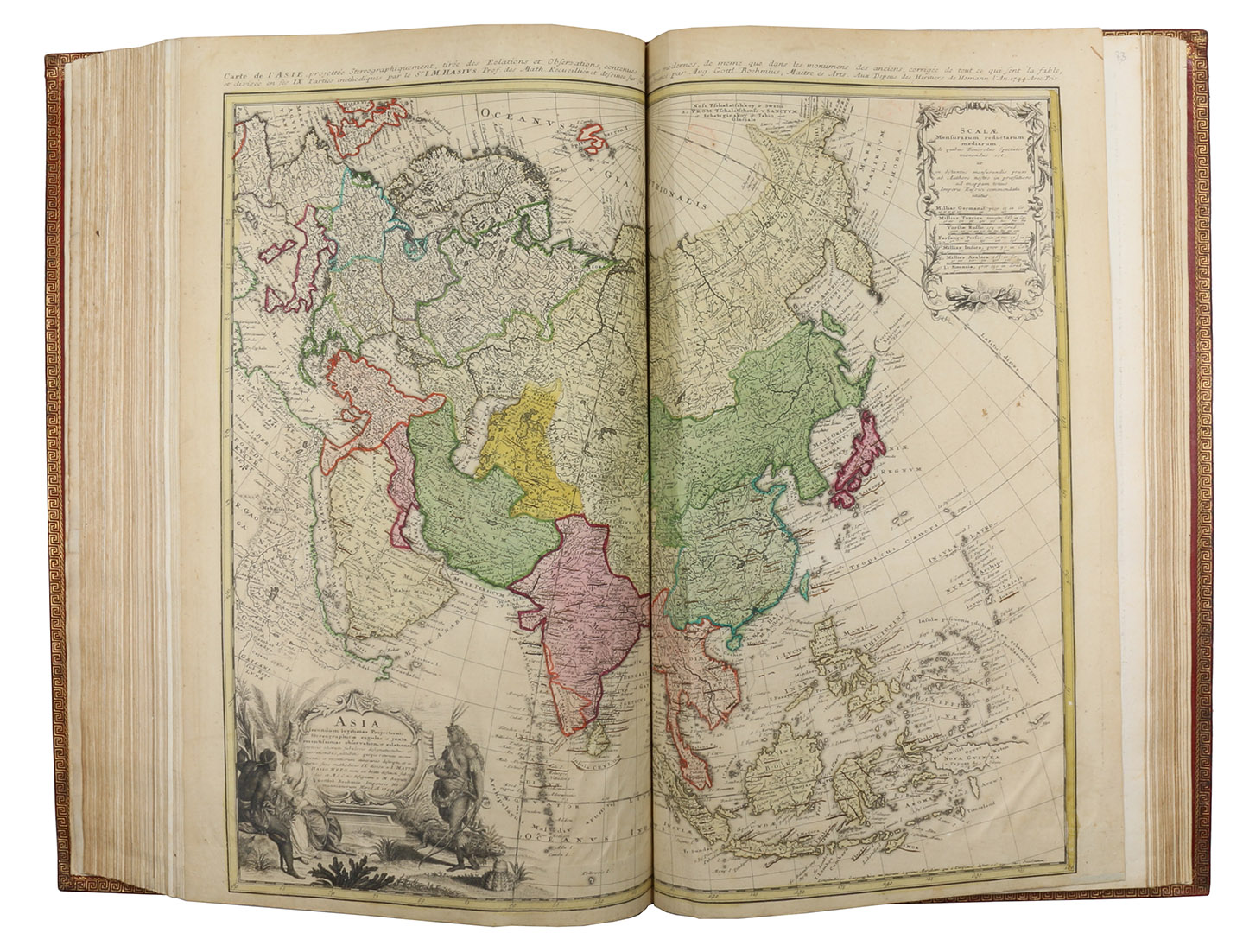 The Lord Wardington copy of the last edition (1737 with later substitutions by the publisher, probably issued ca. 1762) of Germanys most famous 18th-century world atlas in an exceptionally fine binding, commissioned in Vienna around 1800, and with the frontispiece and all maps coloured by an 18th-century hand. After a 40-page introduction and descriptions by Johann Gabriel Doppelmayr, the atlas contains a celestial chart in 2 hemispheres (with pictorial constellations) surrounded by 6 smaller cosmological diagrams; a Copernican solar system; a world map in eastern and western hemispheres plus 4 smaller projections (2 polar and 2 centred on Europe and the South Pacific); the usual maps of the continents and numerous regions in Europe (including postal maps and maps of river valleys); but also maps of the Black Sea and surroundings (including one with the whole of Turkey); Egypt; the Persian (Iranian) Empire; the Ottoman Empire with the Arabian peninsula and the Gulf; China; Mexico, the Caribbean and most of what is now the United States; and 4 half-page maps of British colonies in America (together on a double-page plate).
