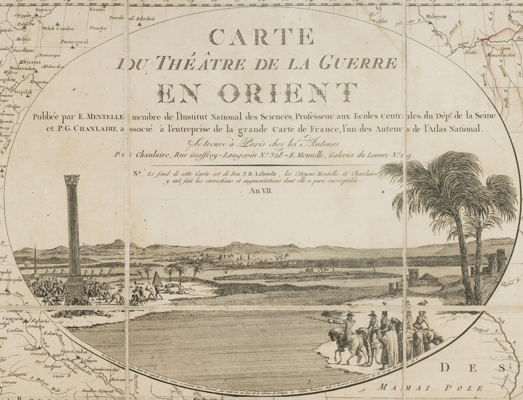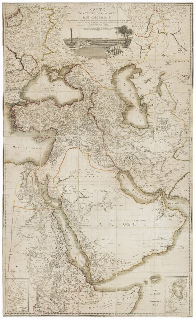 A two-sheet wall map showing Prussia, Turkey, Egypt and Abyssinia in the west, and the Aral Sea in Kazakhstan, Persia, Arabia and Somalia in the east. Two inset maps show the routes from Siré to Gondar and from Gondar to the sources of the Nile. According to the inscription, the map is based on that of "the late J. B. Laborde" (Jean-Benjamin de Laborde [1734-94], a traveller and musician), with amendments; however we have been unable to trace a map of the region by him. - The vast map was published to satisfy French interest when their seemingly-unstoppable General Bonaparte turned his attention to the conquest of Egypt in 1798. Already Napoleon had captured Malta en route to Egypt, and the oval title vignette shows him overseeing the burial of the French dead under Pompey's Pillar after the capture of the important port city of Alexandria (July 1798). - After the defeat of the Mameluk army at the Battle of the Pyramids it was Napoleon's intention to subdue the rest of the Ottoman Empire before moving to threaten British interests in India. However,