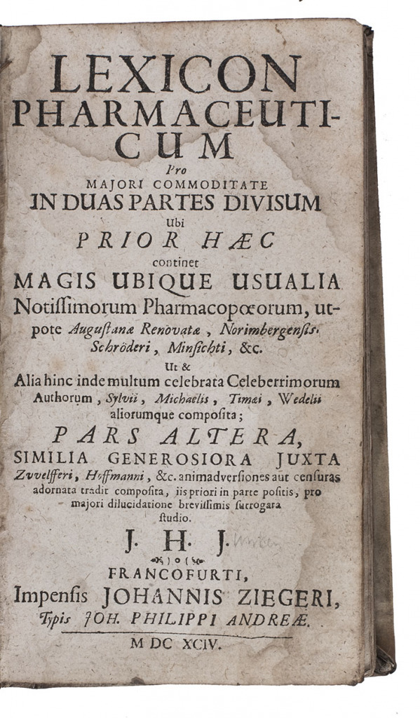 Lexicon pharmaceuticum pro majori commoditate in duas partes divisum ubi prior haec continet magis ubique usualia notissimorum pharmacopoerum, utpote Augustanae Renovatae, Norimbergensis, Schröderi, Minsichti, &c. ut & alia hinc inde multum celebrata celeberrimorum authorum, Sylvii, Michaelis, Timaei, Wedelii aliorumque composita; pars altera, similia generosiora juxta Zvvelfferi, Hoffmanni, &c. animadversiones aut censuras adornata tradit composita, iis priori in parte positis, pro majori dilucidatione brevissimis surrogata studio.