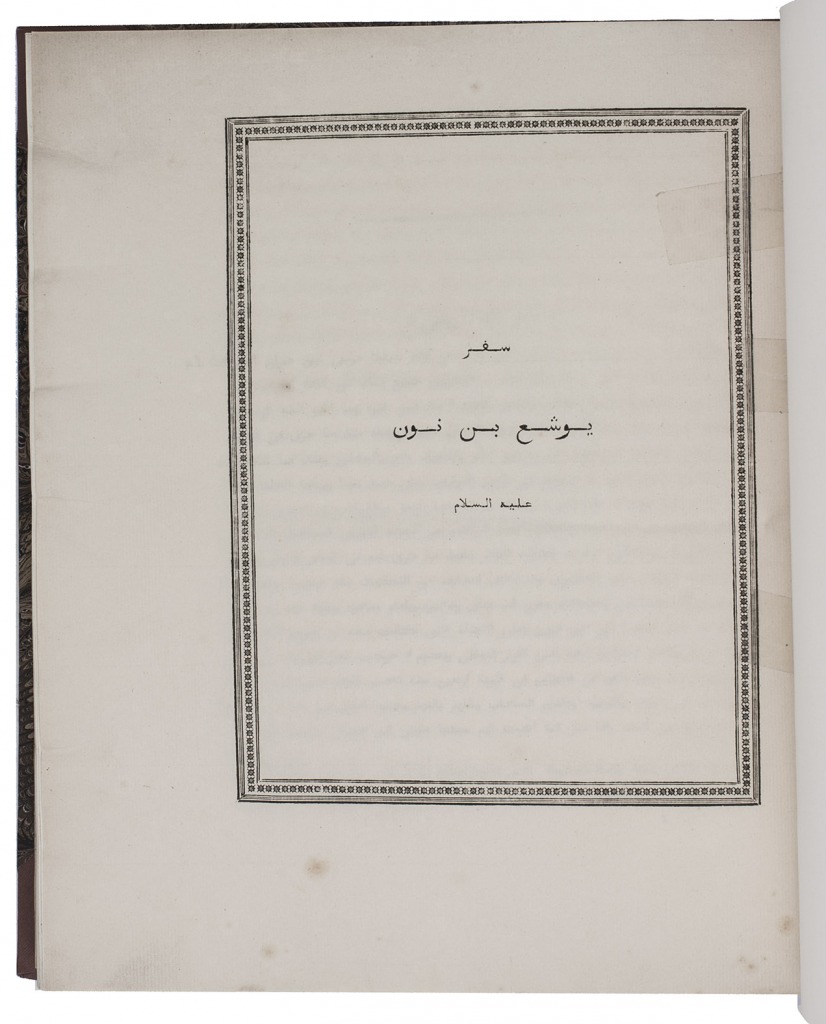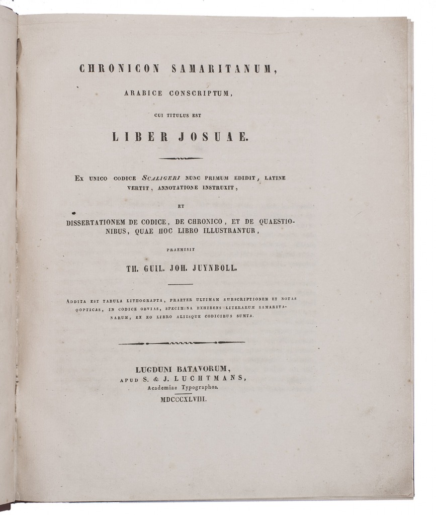 First Arabic edition of the so-called Samaritan book of Joshua, edited by the Dutch linguist and orientalist Theodorus Willem Johannes Juynboll (1802-1861). It is a chronicle mainly devoted to the life and history of the Hebrew prophet Joshua, though written down centuries later and often differing from the canonical Book of Joshua. The present work includes a complete transcription of the Arabic text, together with a Latin translation, Juynboll's commentary and background information. Juynboll based his transcription on a 13th-century manuscript at the Leiden University Library, which had been in the possession of the French-born humanist and Leiden professor Joseph Scaliger. Manuscript versions of the chronicle are extant in both Hebrew and Arabic. It is not known whether the Arabic was originally based on a Hebrew source, but the Hebrew text that has survived up to this day is generally believed to be based on the Arabic text.