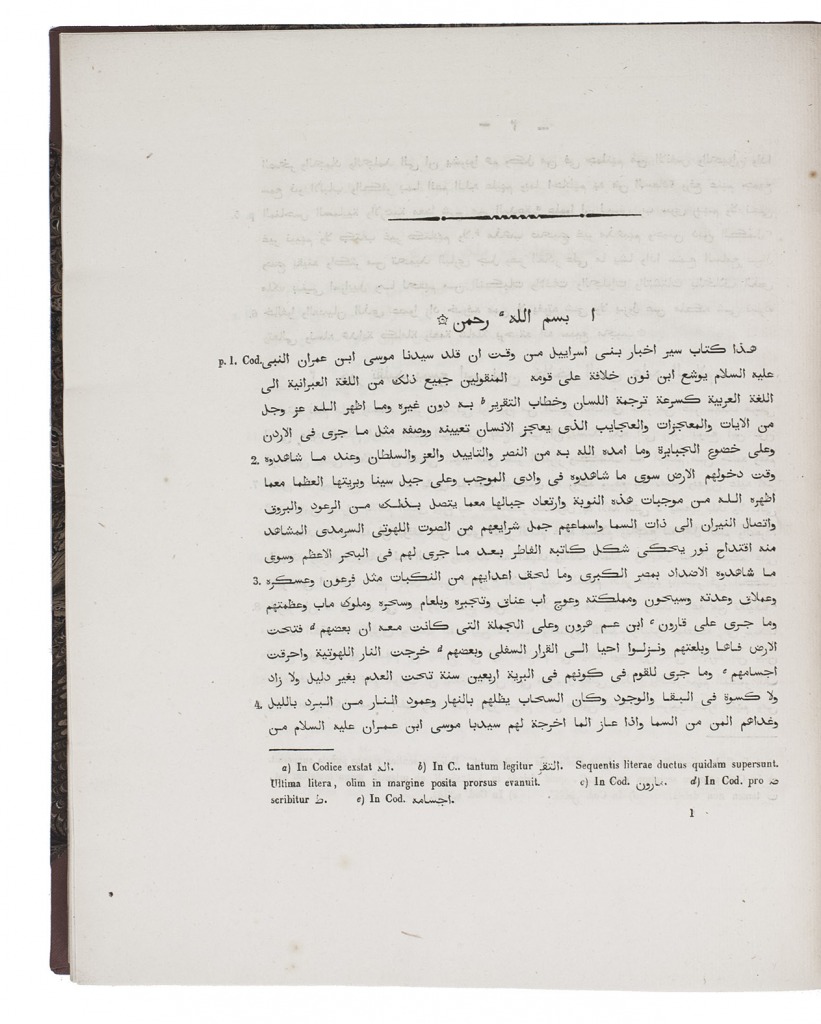 Leiden, Samuel and Johannes Luchtmans, 1848. 4to. With a folding lithographed plate. Set in roman and italic types with the 55-page transcription in Arabic type and shorter passages in Hebrew, Samaritan and Syriac type. Modern half cloth, gold-tooled spine, marbled sides and decorated endpapers. XII, 369; [1], [1 blank], 55 pp.