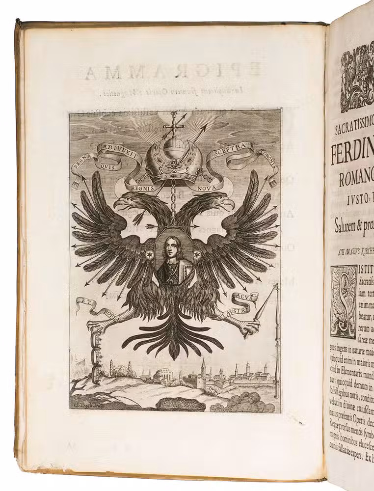 Rome, Biagio Diversin and Zanobio Masotti (printed by Vitale Mascardi), 1654. Folio. With engraved frontispiece by F. Valentius, letterpress title-page printed in red and black with engraved double publisher's device, full-page engraved plate with the portrait of Emperor Ferdinand IV, 34 mostly full-page engraved illustrations, 215 woodcut illustrations and about 50 letterpress tables. Contemporary overlapping vellum. [32], 618, [28] pp.