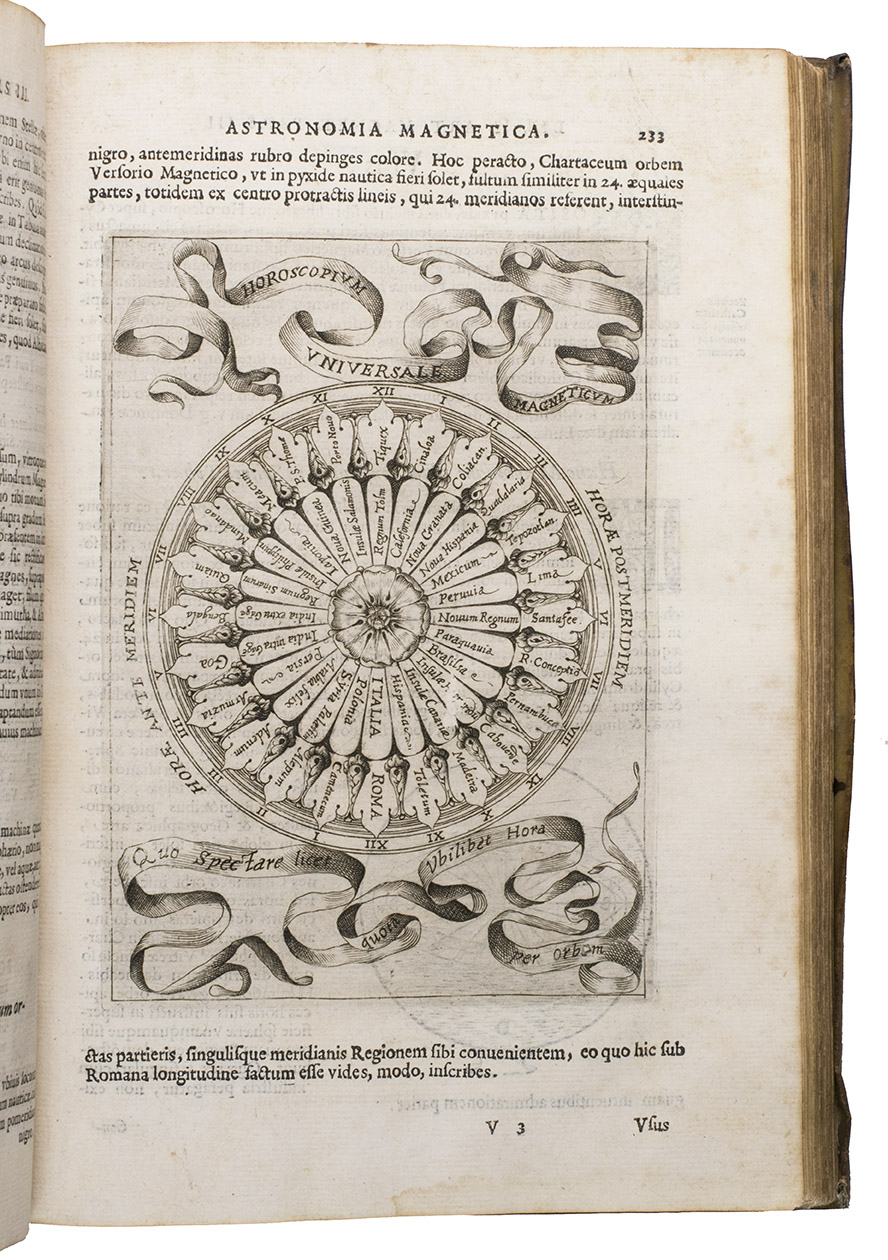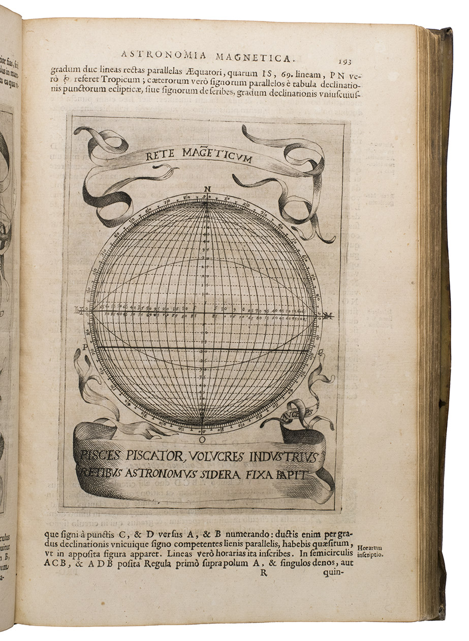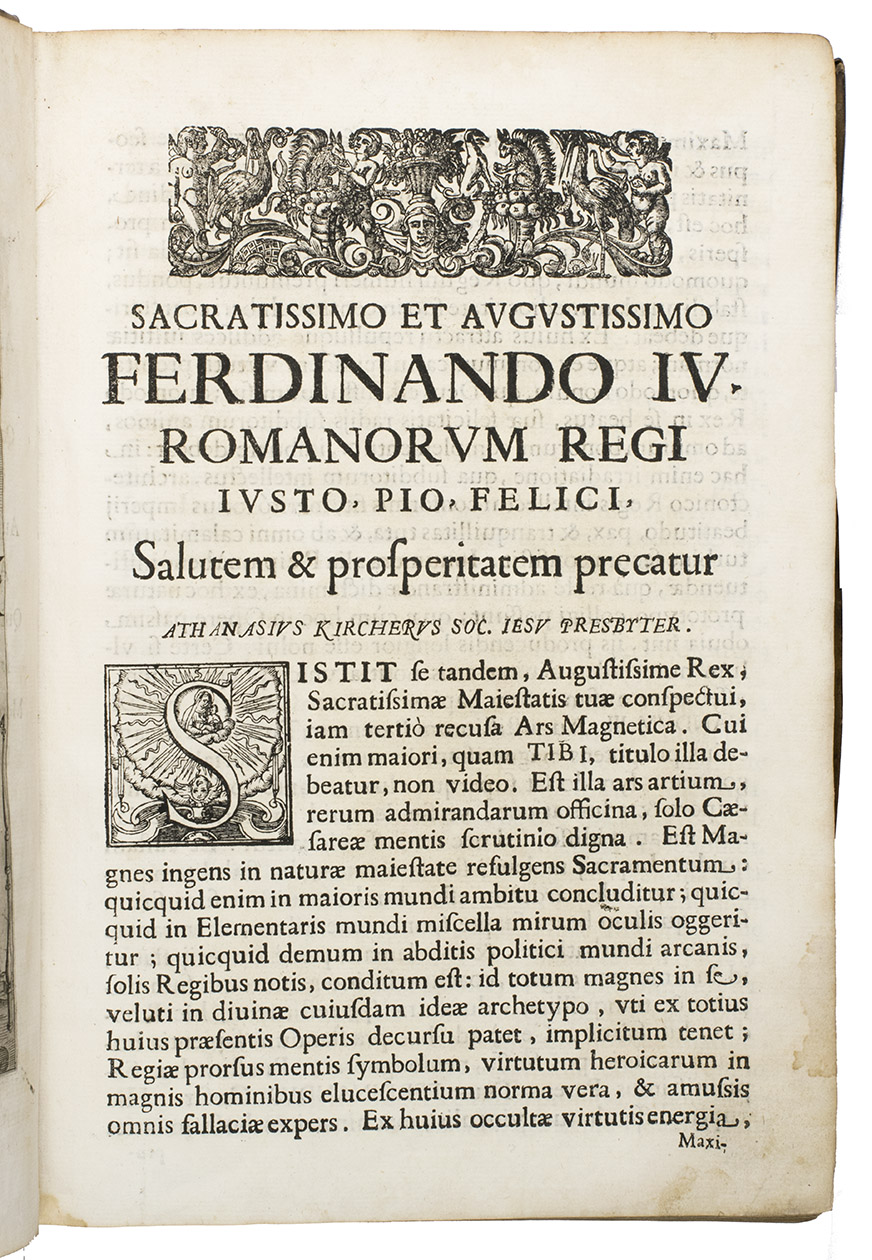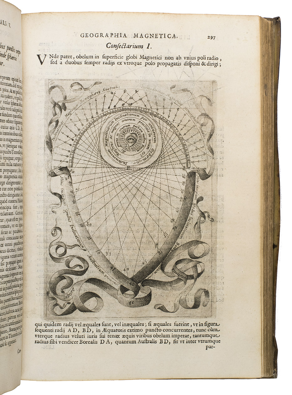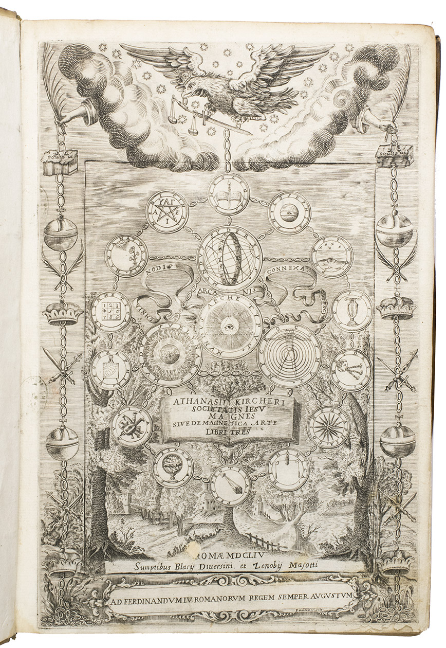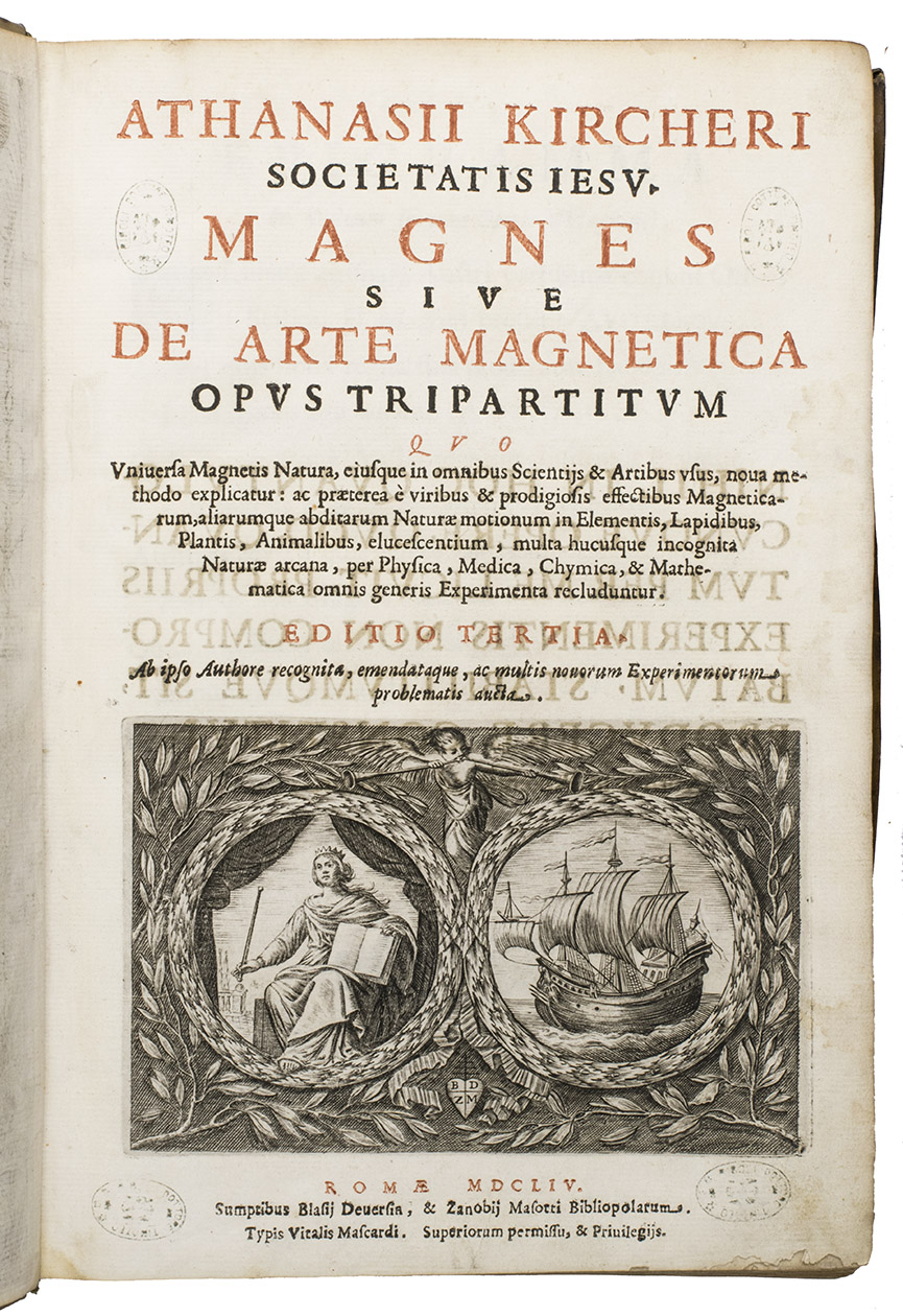 The third, last, best and only folio edition, much enlarged, thoroughly revised and with the engraved and many other illustrations newly made for it, of one of the major scientific works of the famous German Jesuit scholar, Athanasius Kircher (1602-1680), a truly encyclopedic work on magnetism. Kircher published his first major work, Ars Magnetica, in 1631. Only 63 pages in length, it extensively reports on his invention of a method for measuring magnetic power by means of a balance. The present work on magnetism was for Kircher an omnibus of scientific and also phantastic theories. He researched and measured magnetism in numerous situations and applied it to numerous fields of study, including cosmology, astronomy, geography, optics, electricity, medicine, metallurgy, animals, music, love, etc. He was the first to propose using magnetic declination to determine longitude.