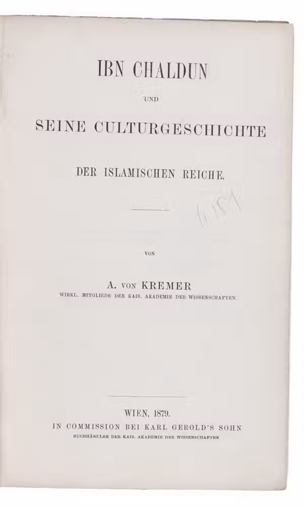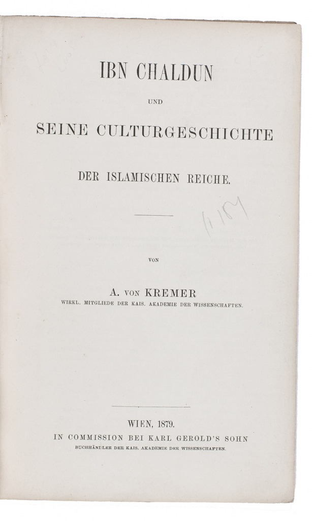 Offprint of an essay on the cultural history written by the Arab historian Ibn Khaldun (1332-1406), written by the German Orientalist Alfred von Kremer (1828-1889). It opens with a brief introduction on Ibn Khaldun's works and life. Other chapters deal with the cultural aspects in Ibn Khaldun's works: basic needs, customs, societies, etc. Included at the end are four brief texts in Arabic type transcribed from manuscripts. The essay was originally published in the same year in the Sitzungsberichte der philosophisch-historischen Classe der kaiserlichen Akademie der Wissenschaften and here published with its own title-page.