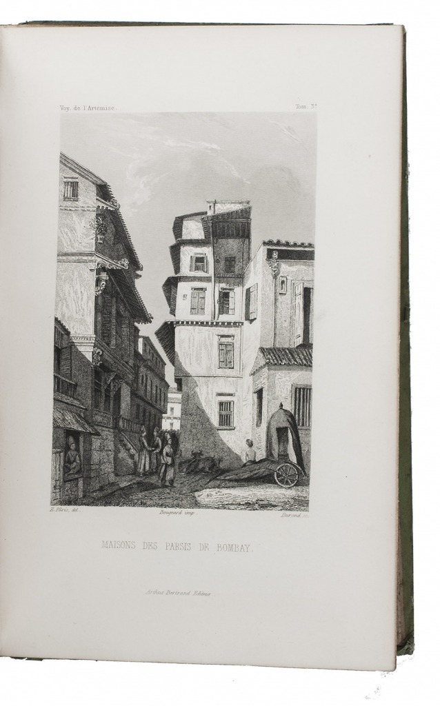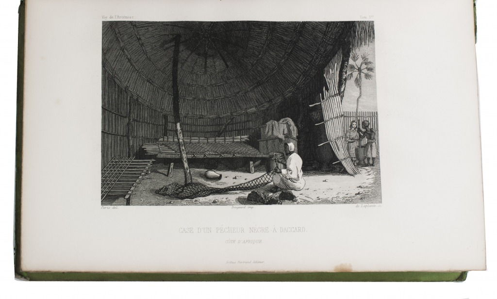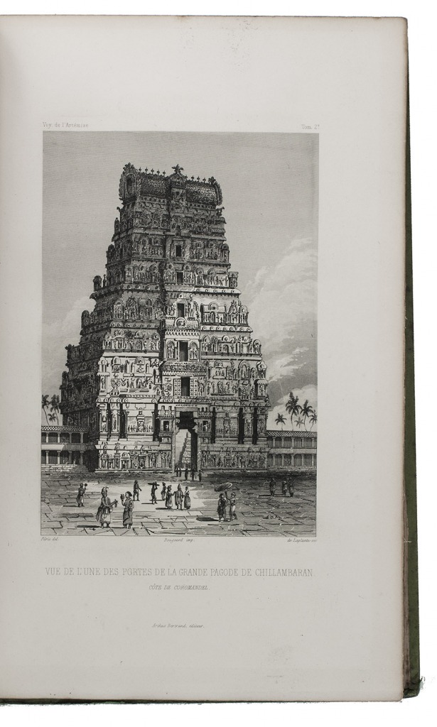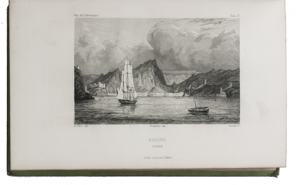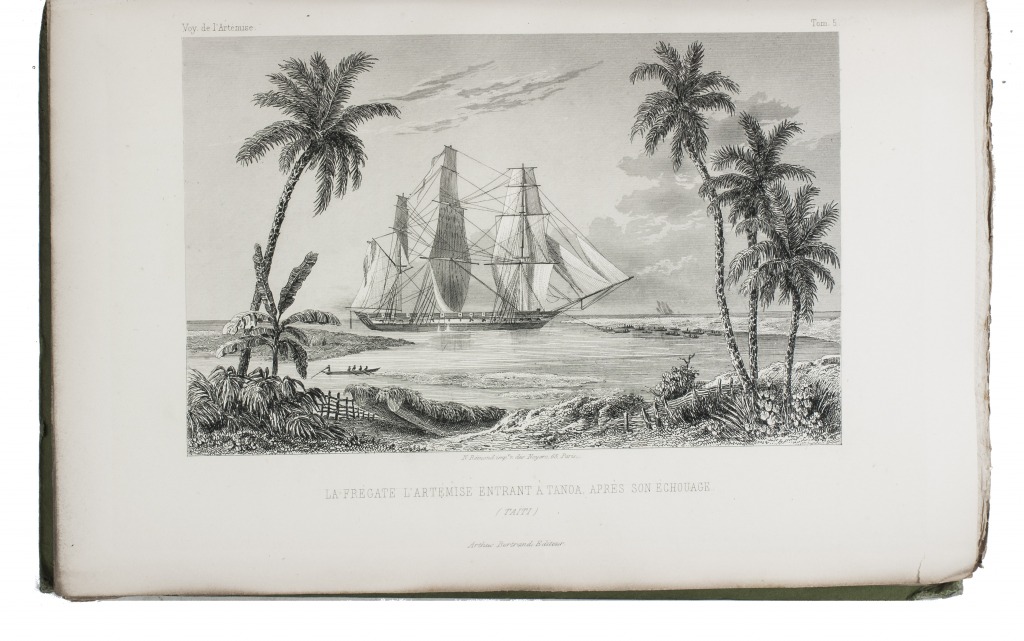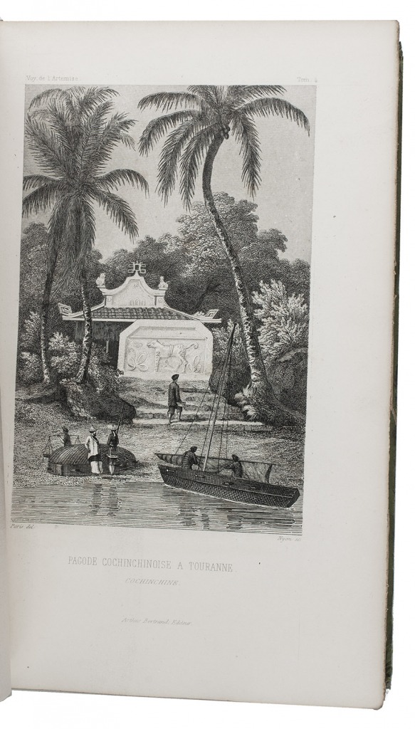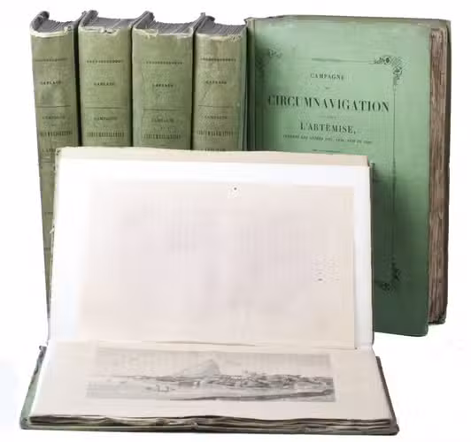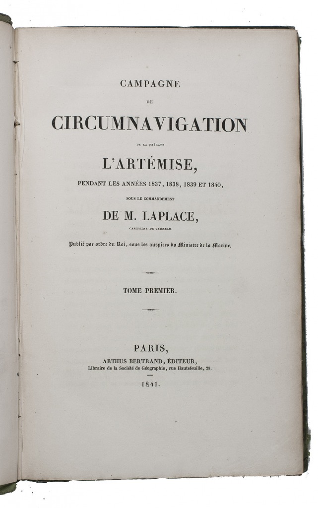 First and only complete edition, containing about 2800 pages of official reports of one of the most important 19th-century circumnavigations of the globe, especially valuable for its information on Tahiti and Hawaii, and for its detailed view of the political manoeuvrings of the various colonial powers with each other and with the indigenous populations, both in the Pacific and elsewhere. The 31 stunning steel-engravings ("fine quality": Forbes) enrich the account greatly. Besides the well-known Pacific views (Hawaii, Tahiti, Tasmania, the Philippines, Vietnam) they include mosques at Karikal and Kolkotta in India and views of Oman, Mocha, Brazil, Peru, California and much more. Laplace also provides valuable information about trade on the coasts of the Arabian peninsula (including Muscat, al-Muka and Bandar-Abbas) and Iran. This was Laplace's second circumnavigation of the globe, sailing in the ship l'Artémise, beginning in 1837, five years after he returned from his voyage in La Favorite. The world map shows the routes of both voyages (the second map shows the Indian subcontinent and surroundings in more detail).