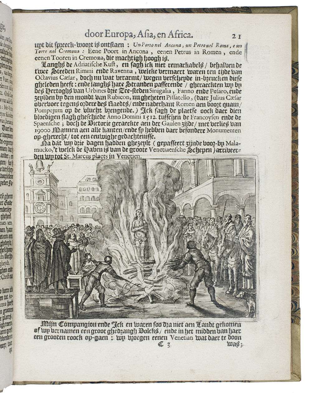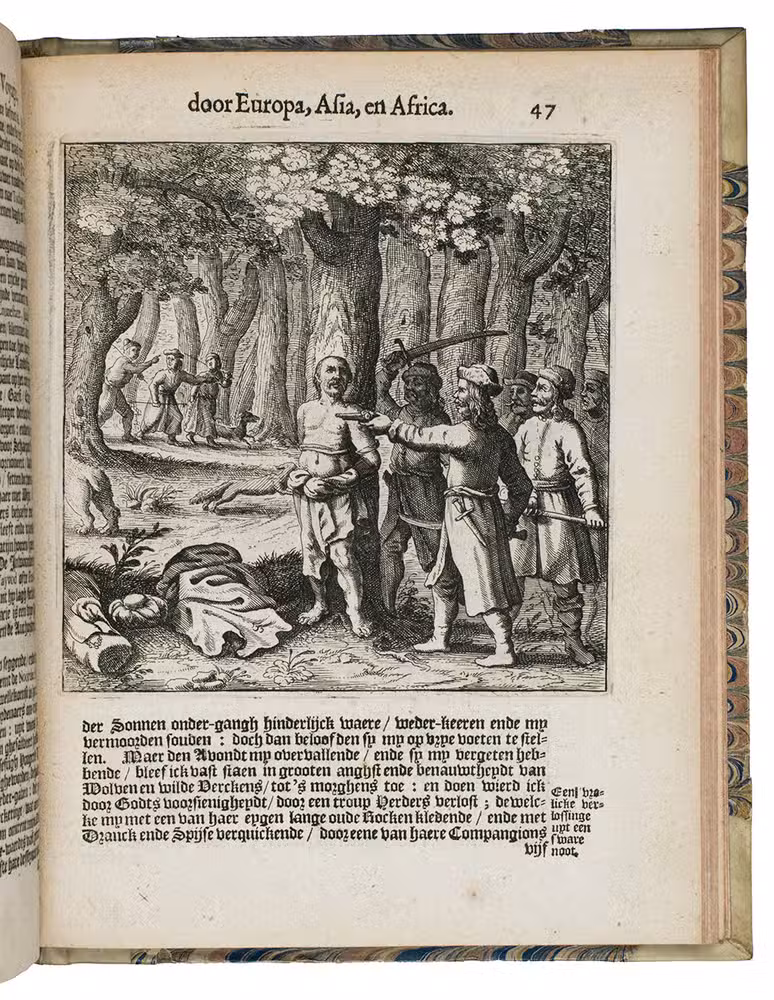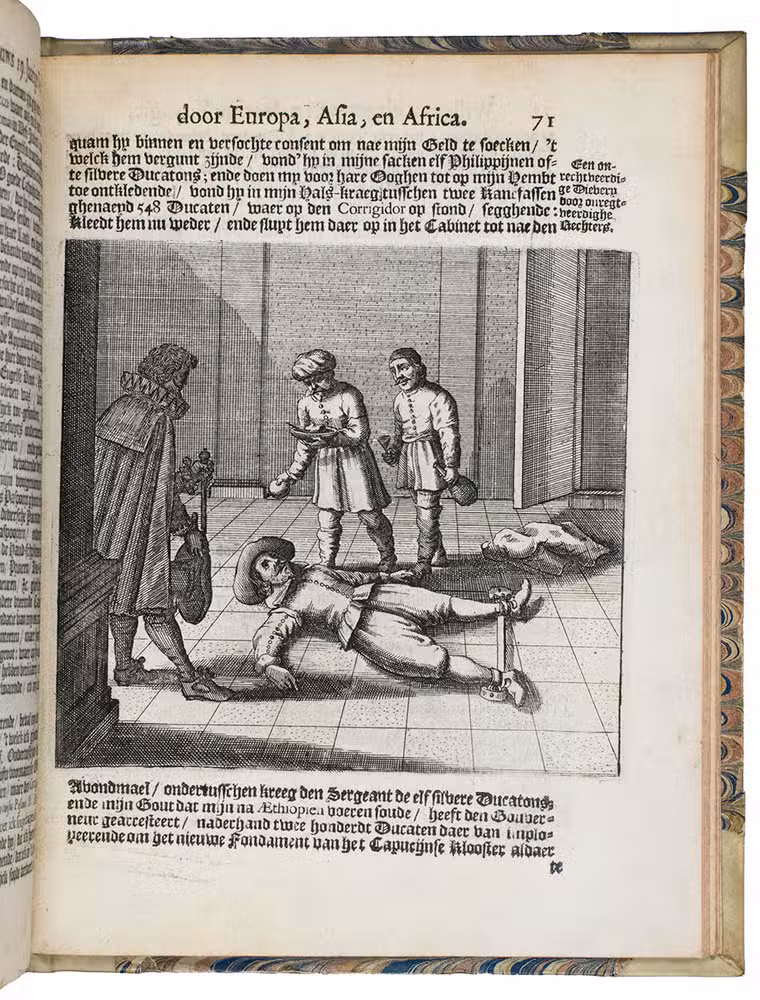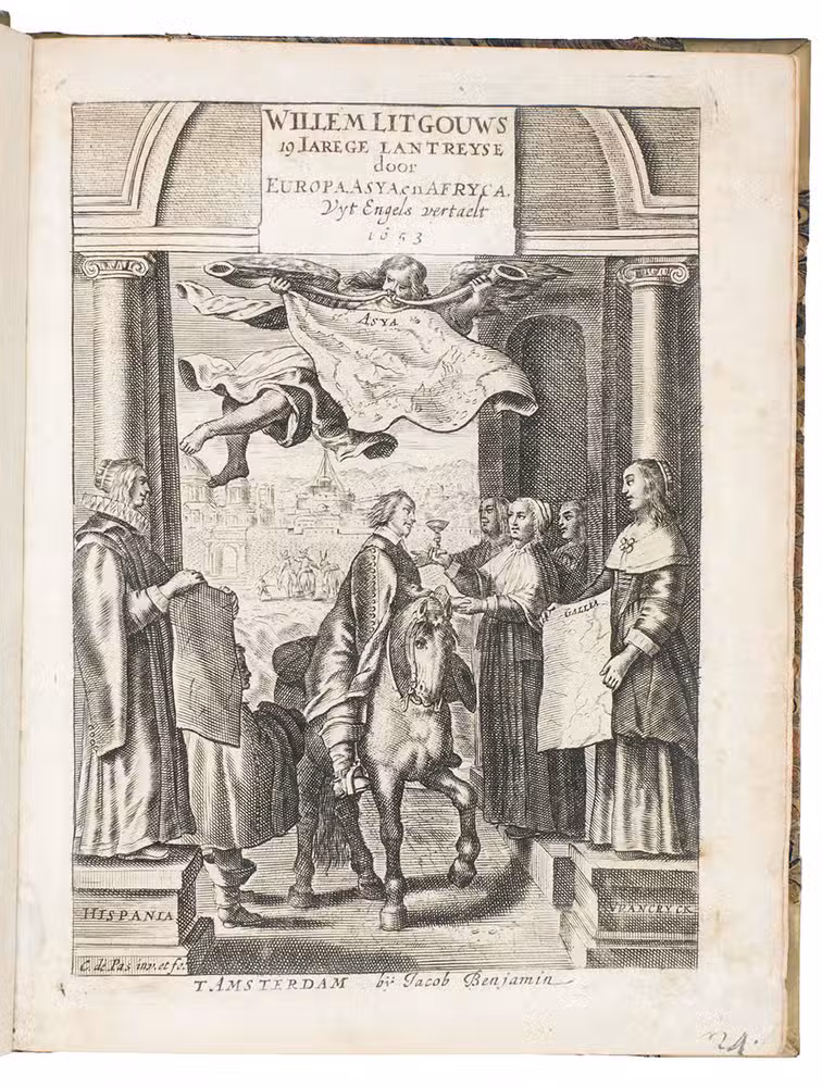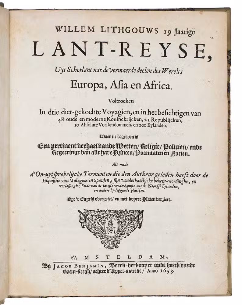Second Dutch edition of a classic account of three voyages by the Scotsman William Lithgow (1582-1645?), mostly on foot, from Rome to Greece, Crete, Turkey, Cyprus, the Holy Land, Egypt, Malta, continental Europe and North Africa, including the British Isles and the Iberian peninsula. He gives an account of coffee, describes Turkish baths and long Turkish tobacco pipes, pigeon post between Aleppo and Bagdad and the hatching of chicken eggs by artificial incubation, all largely unknown in Europe when he wrote.