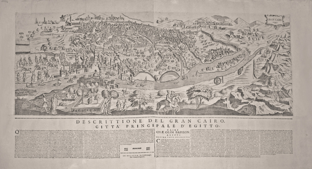 Unrecorded in the standard bibliographies and without counterpart in western libraries: unique, large-scale views of Cairo and Alexandria. The Muslim influence may be discerned in the people's clothing in the foreground as well as in both cities' architecture. On the river Nile, the views depict numerous trade boats and sailors. The Italian (and, in the case of Cairo, Latin) letterpress text pasted under the engraving provides mostly historical and geographical information.