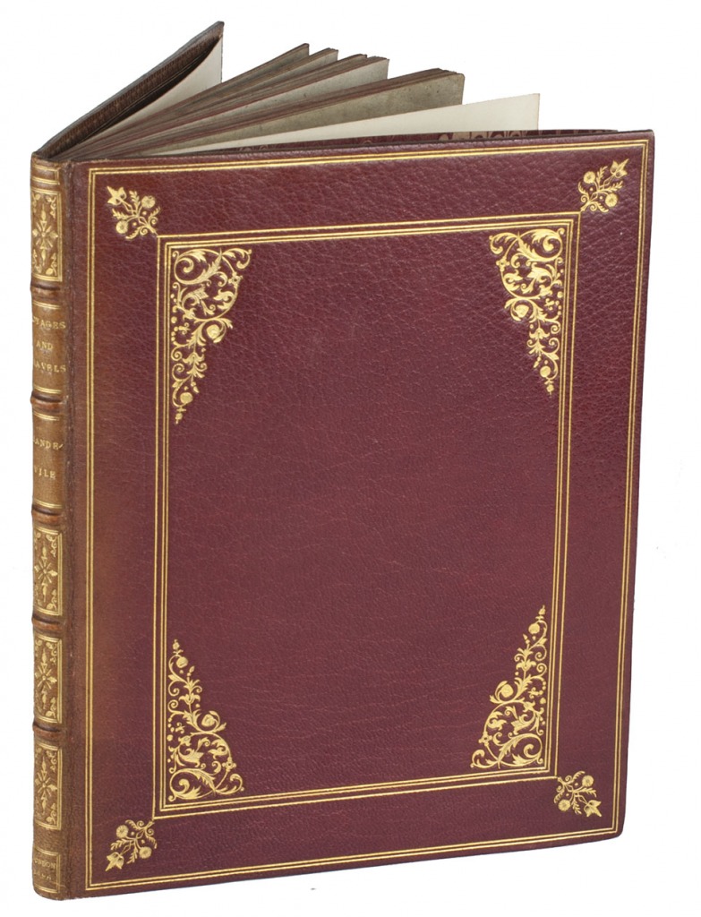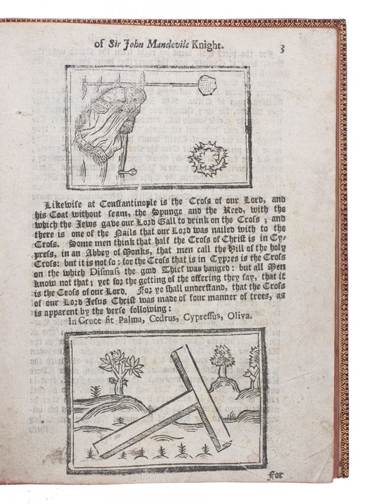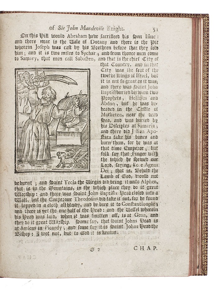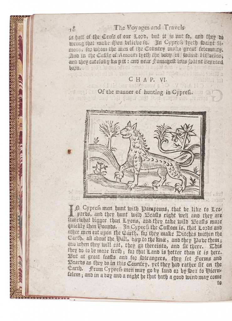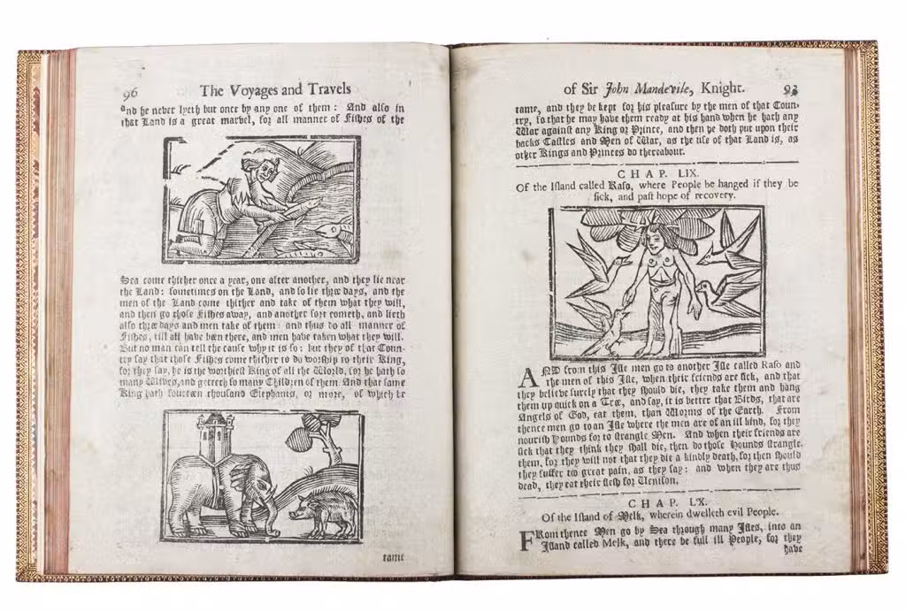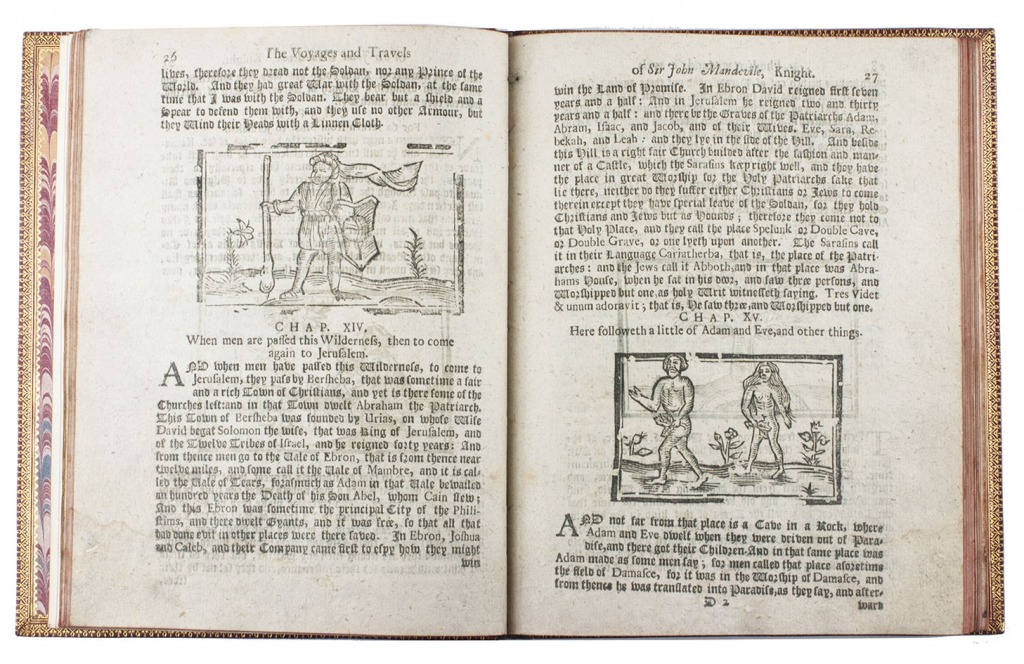 A rare 17th-century English edition, with about 60 different woodcut illustrations, of a classic and partly fictional 14th-century account of travels presented as voyages of Sir John Mandeville through Turkey, Egypt, Ethiopia, Syria, Persia, Arabia, India and the East Indies. It was originally written in French and is thought to have been compiled from various sources by Jehan d'Outremeuse (1338-1400) of Liege. It includes many well-known stories and illustrations of monstrous people and animals in exotic lands: a man with only one enormous foot that he can use as a parasol, a dog-headed man, a man with his face in his chest, a girl who turns into a dragon, griffins, nine-meter giants, ants that gather gold, diamonds that mate and give birth to baby diamonds and much more that spoke to the imagination. The book also includes genuine descriptions of the regions covered and gave many Europeans their first notions of the Near East, Middle East, India and East Indies. The part on Arabia includes an account of the birth of Mohammed.