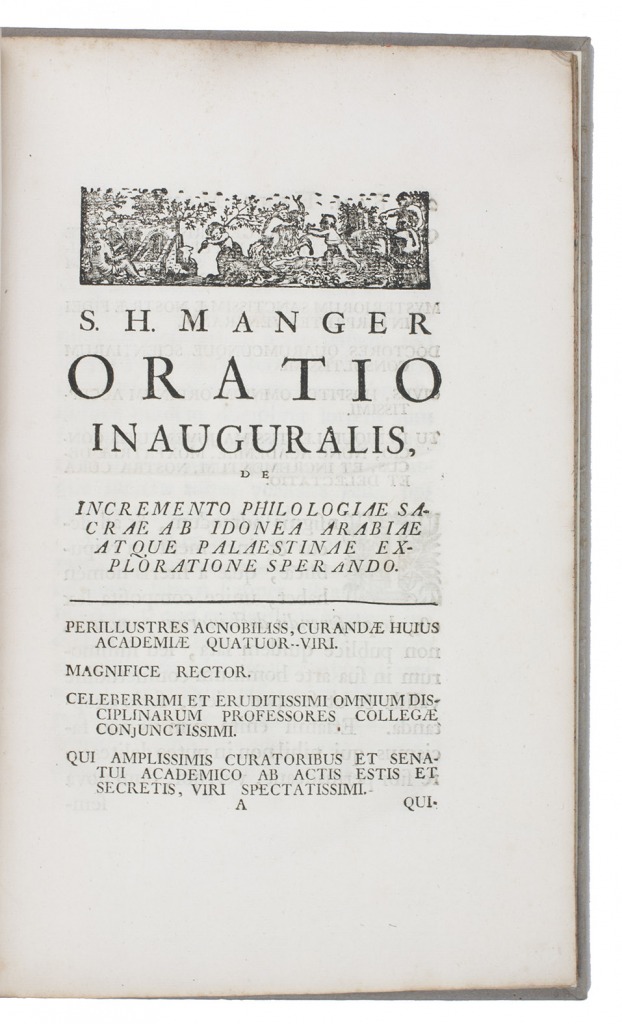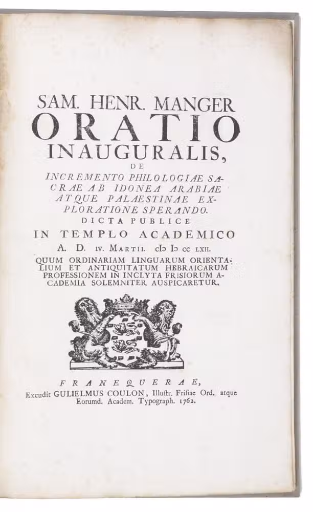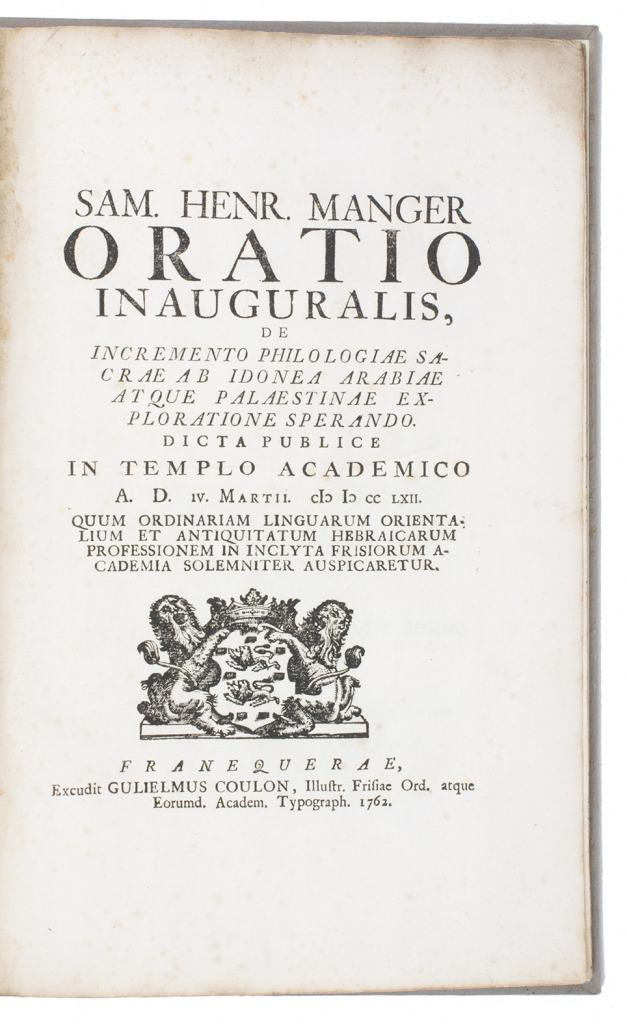 First and only edition of an inaugural lecture by Samuel Hendrik Manger (1735-1791), appointed ordinary professor of oriental languages and of Hebrew antiquities at the University of Franeker in 1760. Partly under the influence of the orientalist Albert Schultens, Manger valued Arabic studies for the insights they gave into Old Testament scholarship. In his present inaugural lecture, he discusses the controversial expedition to Palestine that several scholars were planning to make in that year. It shows his interest in archaeological research carried out in expeditions instigated by the German scholar Johann David Michaëlis. Manger believed they would inaugurate a new era in Biblical scholarship.
