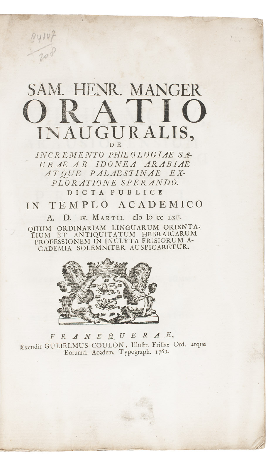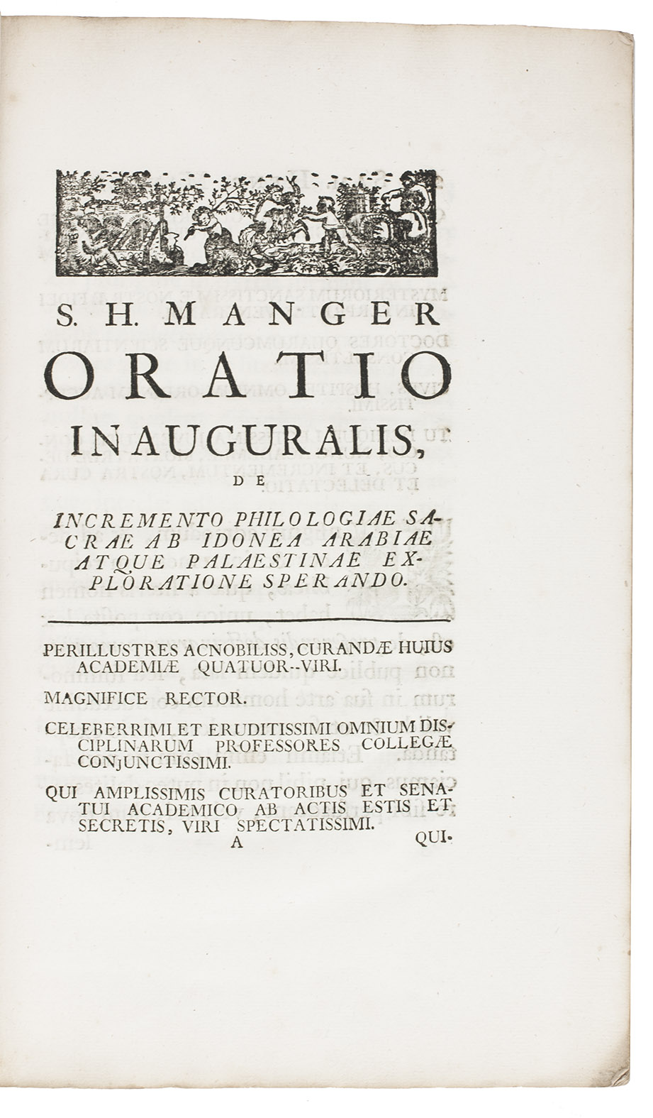 First and only edition of a Latin oration delivered at the University of Franeker by Samuel Hendrik Manger (1735-1791), Arabist and specialist in Oriental languages and Hebrew antiquities, who had been appointed professor of oriental languages at the University in 1760. It shows his interest in archaeological research carried out in the Near East by means of voyages instigated by the German scholar Johann David Michaëlis. Manger thought this kind of research would herald a new age in our understanding of the scriptures.