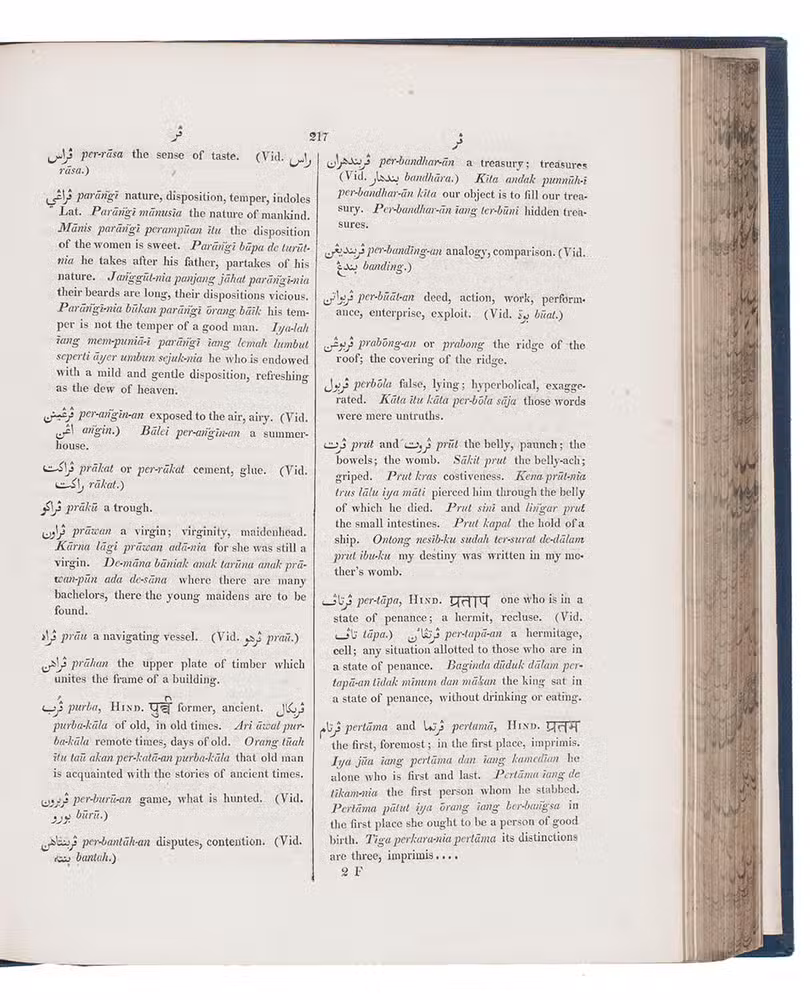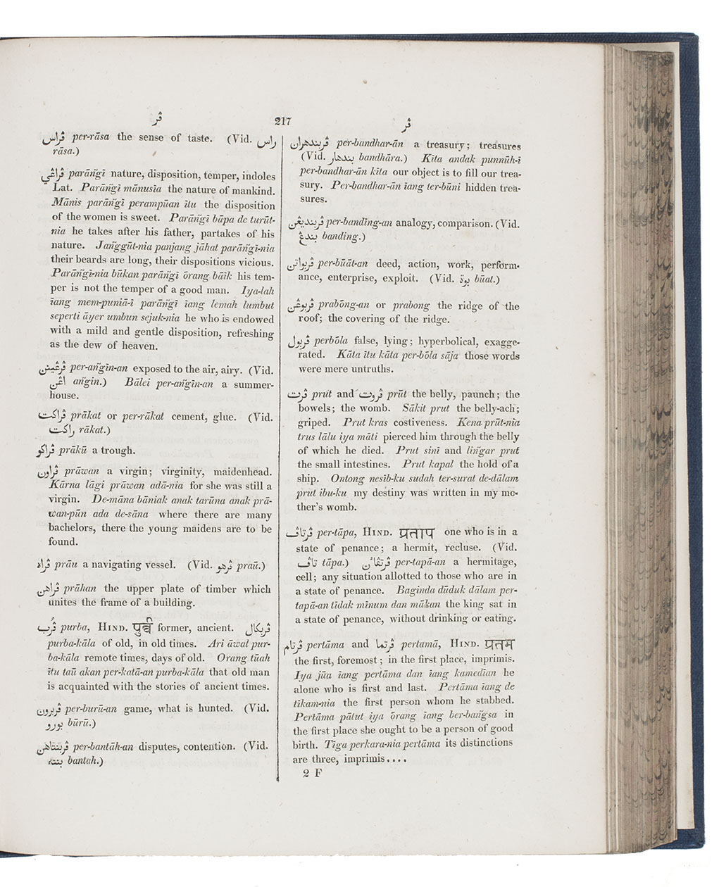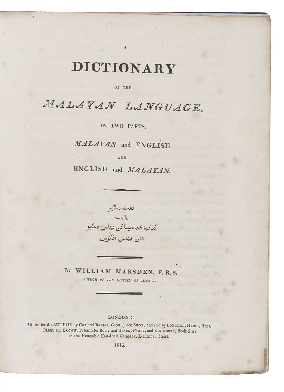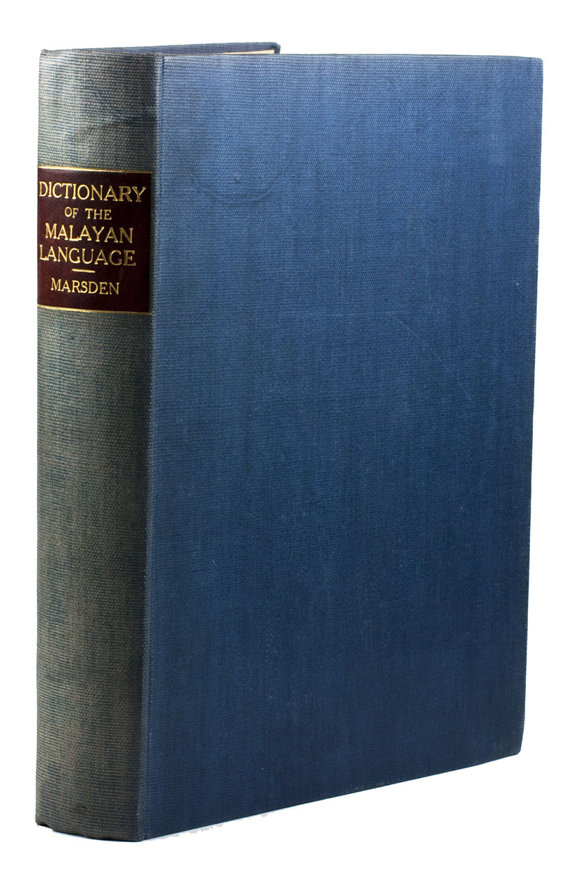 First edition of Marsden's excellent Malay dictionary, which quickly succeeded all earlier dictionaries and set the standard for those that followed. The author's 16-page introduction discusses the language and the arrangement of the dictionary and ends with a brief table showing the Malay alphabet, with reference to the grammar for a more detailed one. The main part of the book is a Malay-English dictionary, arranged alphabetically following the Arabic script. The headwords are in the Arabic script followed by a phonetic transcription and an often very detailed definition in English, sometimes including related Hindi words in the Devanagari script. The shorter English-Malay dictionary gives the English headwords alphabetically, usually followed by several possible translations in the Arabic script, each with a phonetic transcription but without the detailed explanations of the Malay-English dictionary.