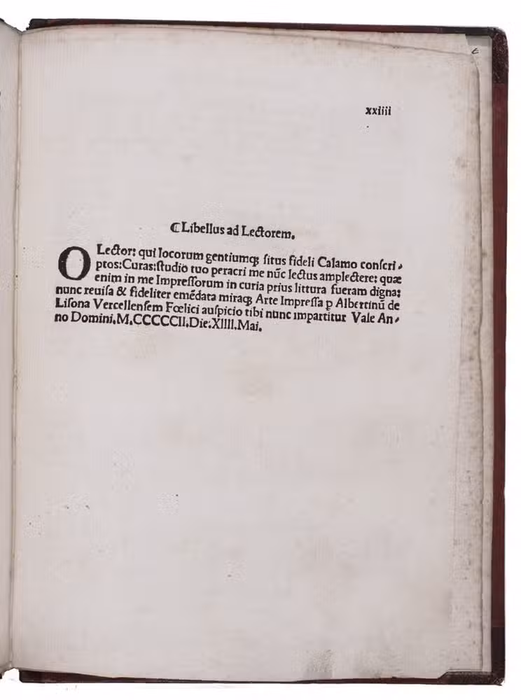 [Venice], (colophon: printed by Albertino da Vercelli, 14 May 1502). Small 4to (20.5 x 15.5 cm). With printed guide letters left for manuscript initials (not filled in). Gold-tooled red half sheepskin (ca. 1820?). XXIIII ll.