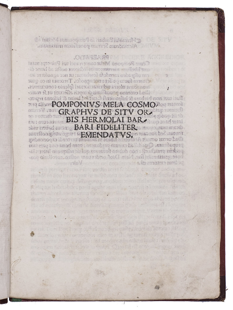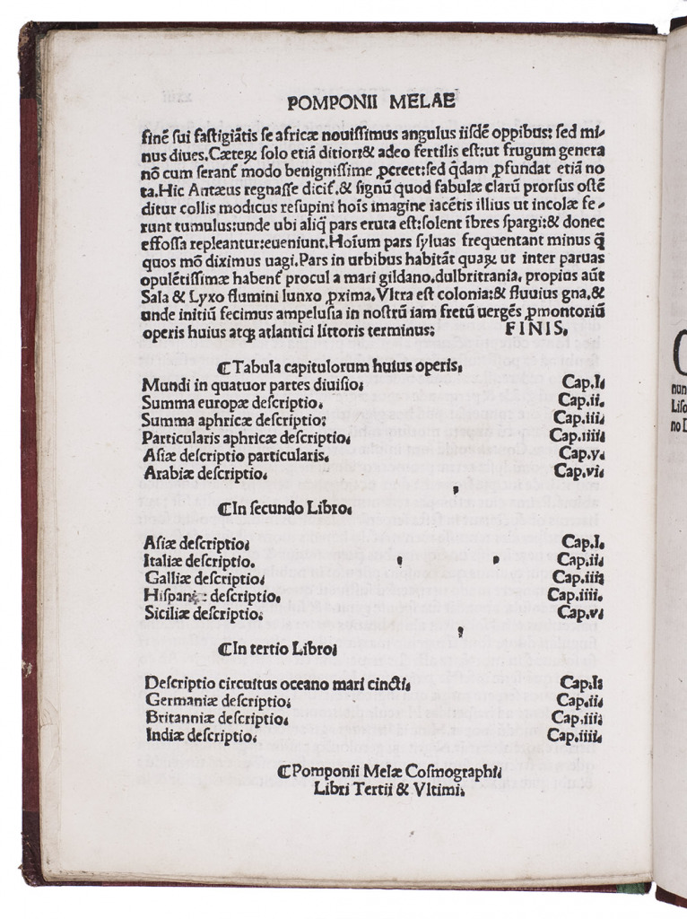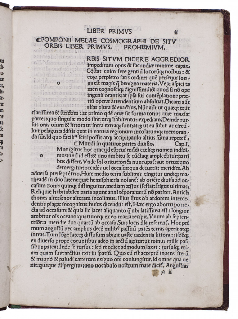 Rare 1502 edition, the third in the best and most important early recension of Pomponius Mela's description of the world, written ca. AD 43, the earliest surviving geographical work in Latin and one of Pliny's most important sources, perhaps the most important for geography. Pomponius describes Europe, Africa and Asia, the three together surrounded by the ocean. He was at born in southern Spain (we don't know where he wrote) and shows a more detailed and more accurate knowledge of Spain, France and the British Isles than earlier writers (giving us our first known reference to the Orkney Islands) and even knows of the existence of Scandinavia. But he also devotes book I, chapter VI to "Arabia", which includes not only the Arabian peninsula but also "Syria" (which includes what is now Iraq) and other parts of the Middle East, and his description of India in book III, chapter IV, gives further information about what seem to be the Arabian and Iranian coasts of the Gulf, Egypt, Iraq, the island of Masirah and the cities of Aden and Harran.