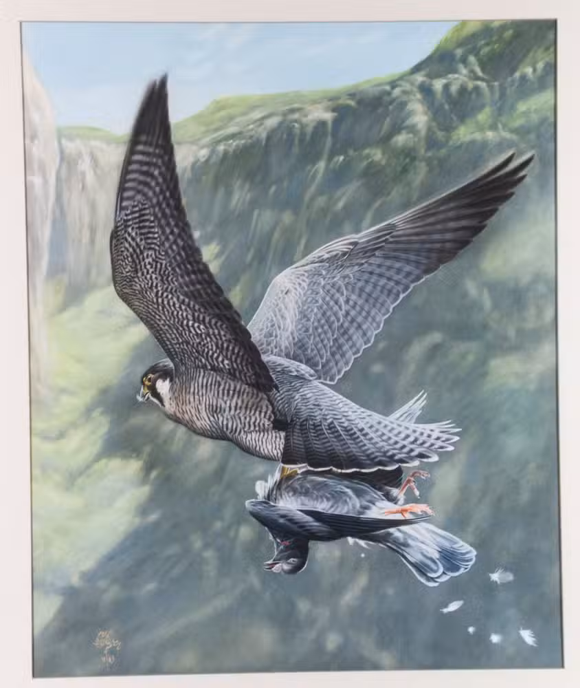 Impressive, large sized drawing by the 20th-century Dutch artist and illustrator Hans Michielsen, depicting a peregrine falcon flying with its prey in a mountainous landscape. This peregrine falcon is a bird of prey in the genus "Falco" of the subfamily "Falconinae". Its name was changed to "Falco peregrinus" (pilgrim falcon) in 1771 by the English ornithologist Marmaduke Tunstall (1743-1790). It ranks among the largest falcons and is renowned for its speed, reaching over 320 km/h during a high-speed diving stoop to take a quarry. Because of its equable disposition, it is one of the most popular falcons used in falconry.