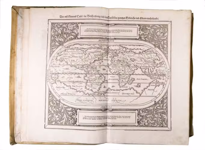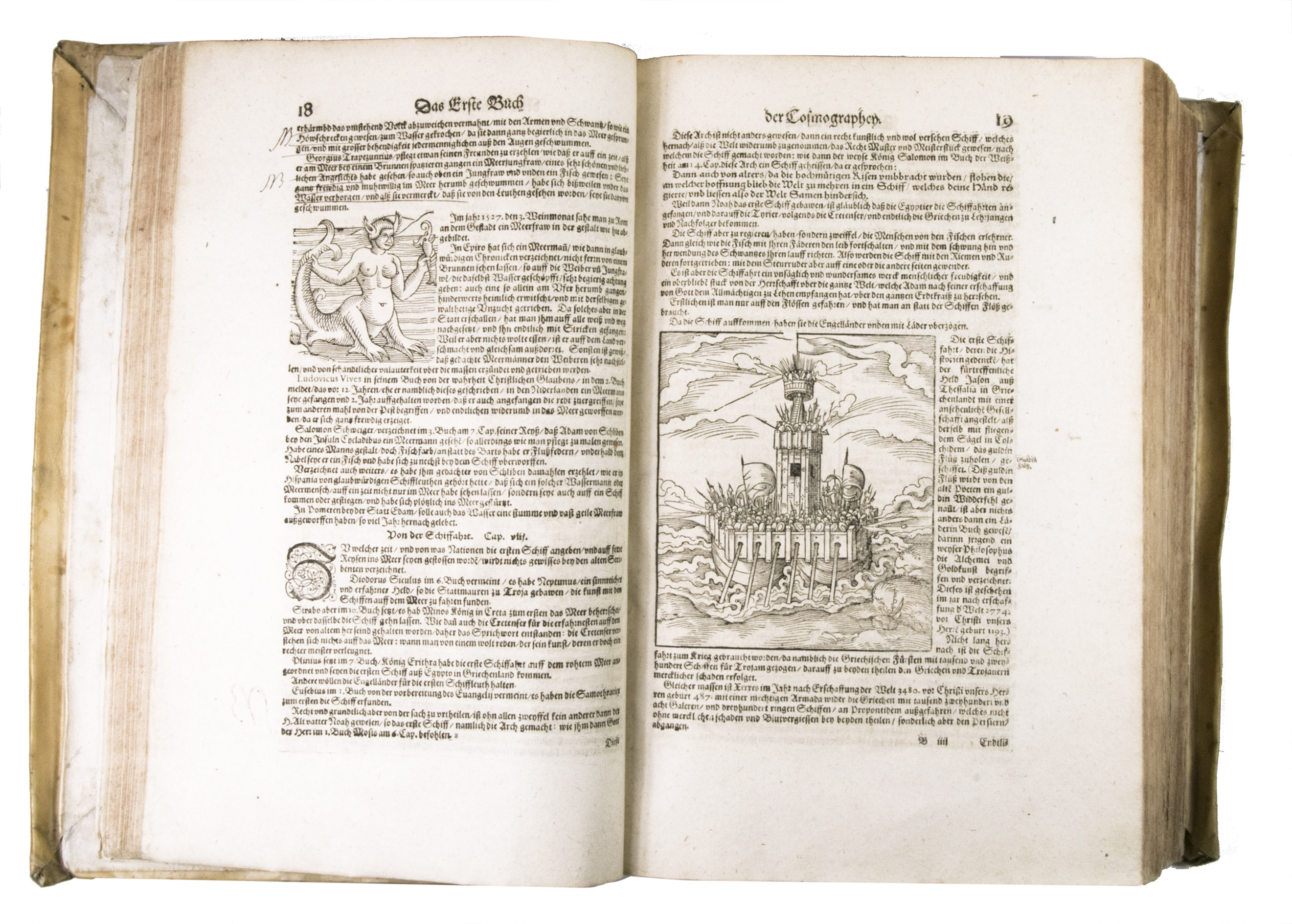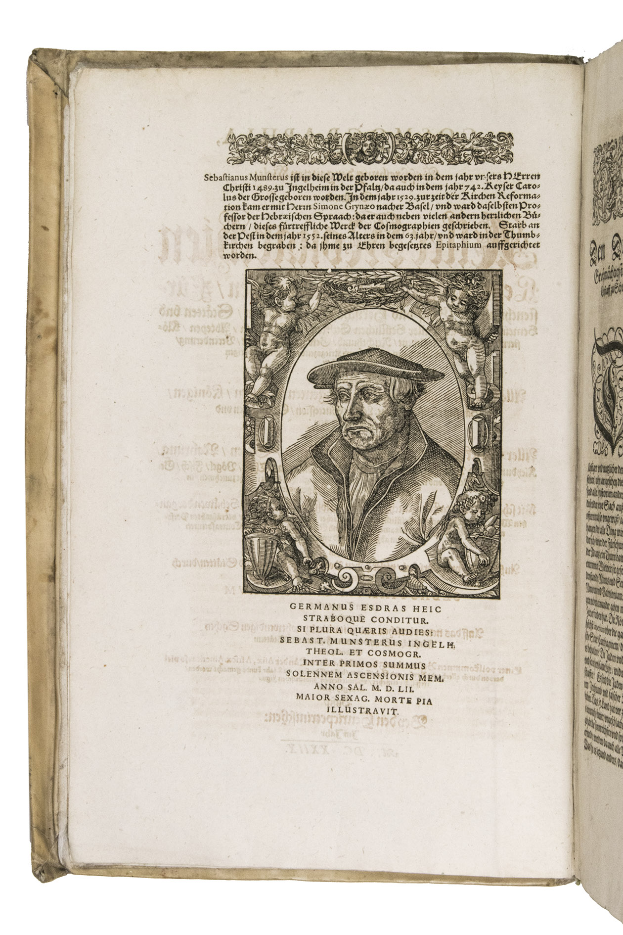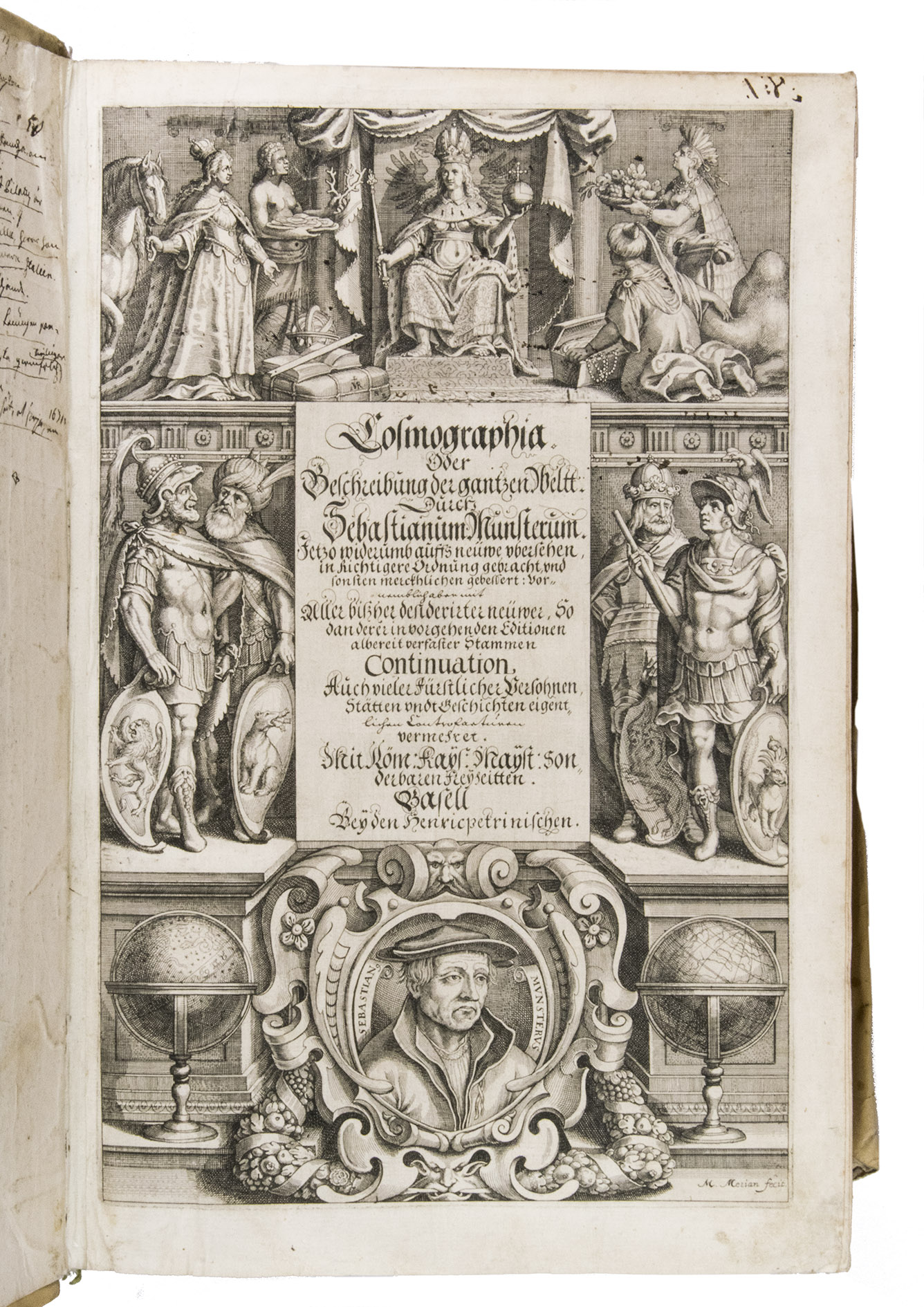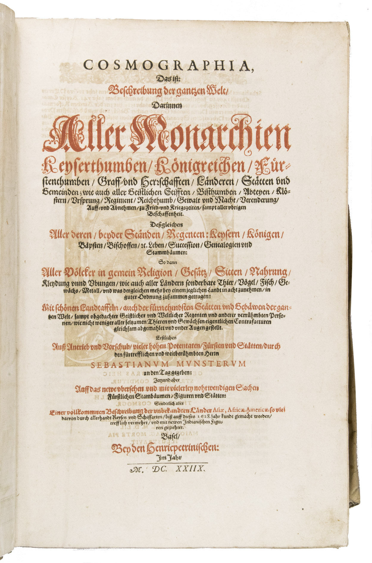 Basel, heirs of Sebastian Henricpetri, 1628. Folio (38 x 24.5 cm). With engraved title-page, letterpress title-page printed in red and black with woodcut portrait of Münster on the back, 26 numbered double-page woodcut maps on inserted bifolia, 72 double-page woodcut maps, plans and views on integral leaves, and about 1500 woodcut illustrations in the text (including repeats) showing maps, plans, views, plants, animals, monsters, etc. Contemporary vellum. [24], “1752” [=1748] , [12] pp.