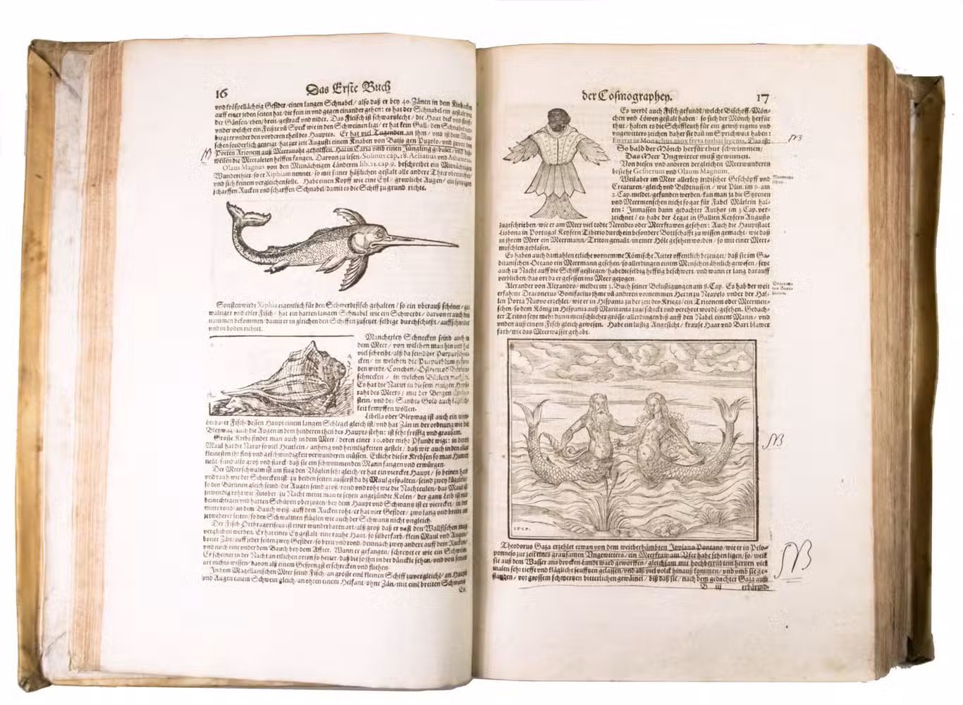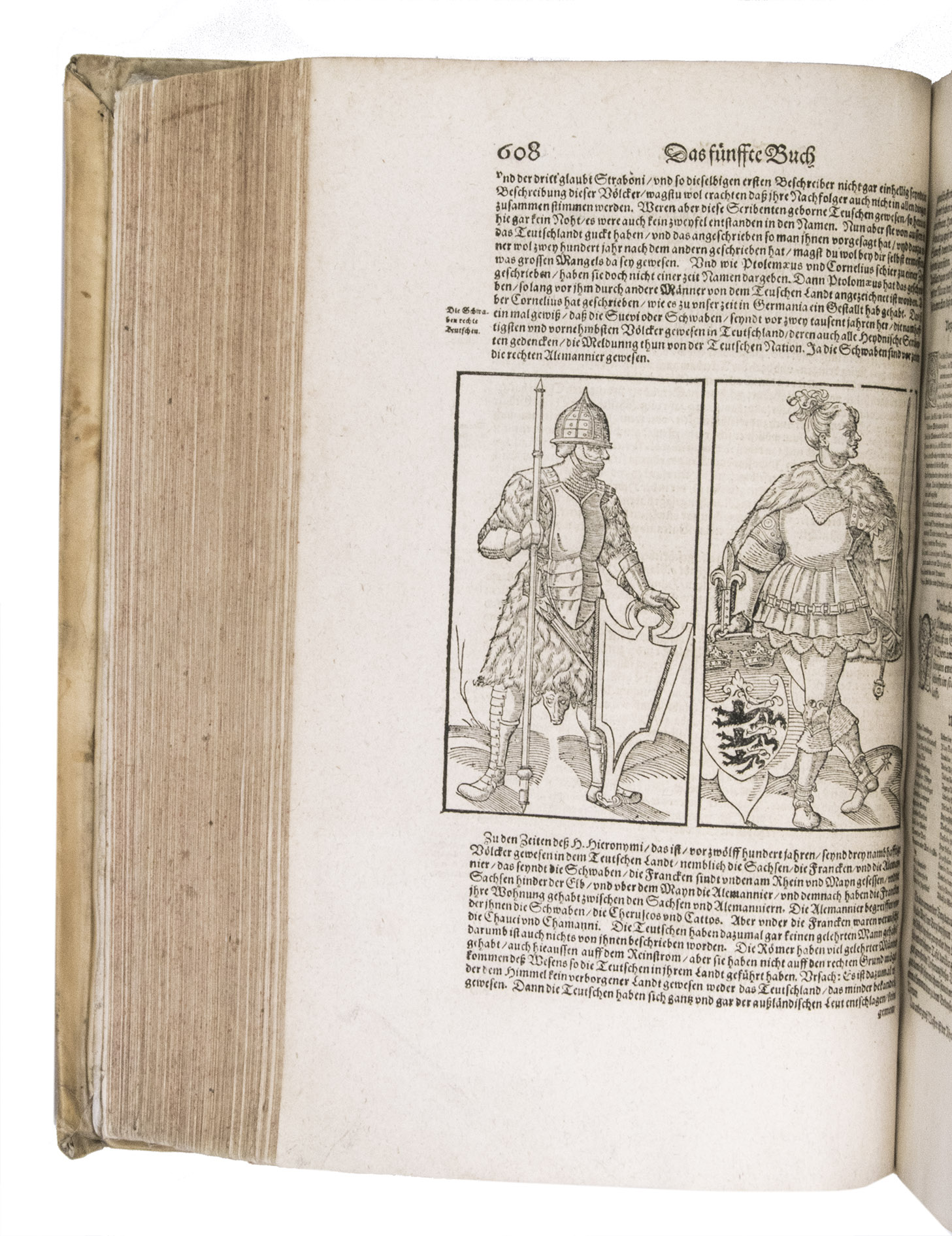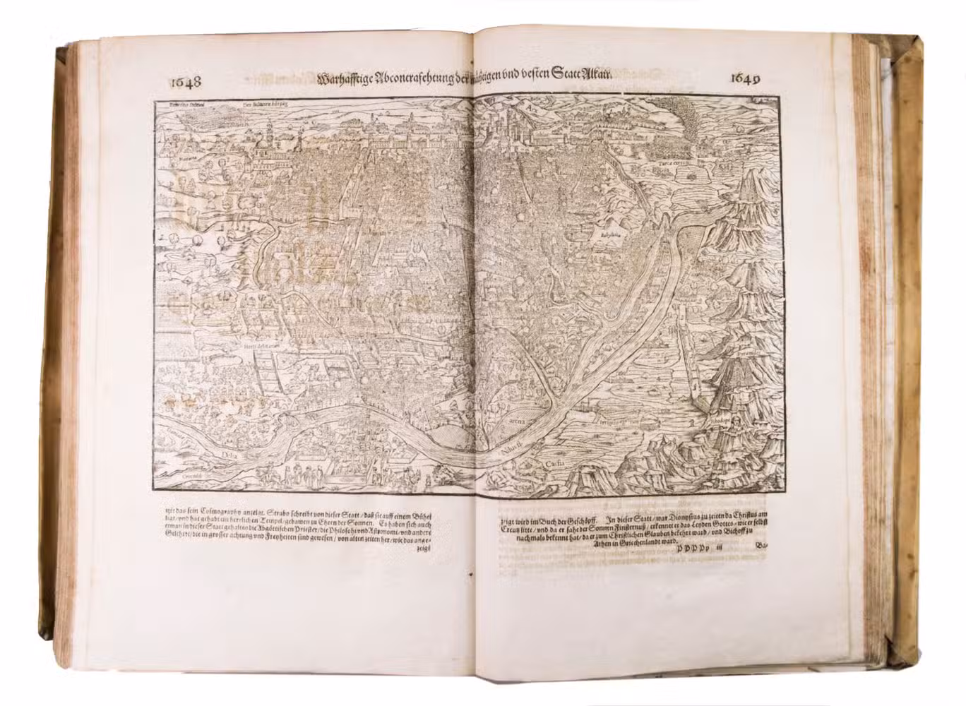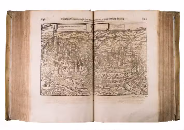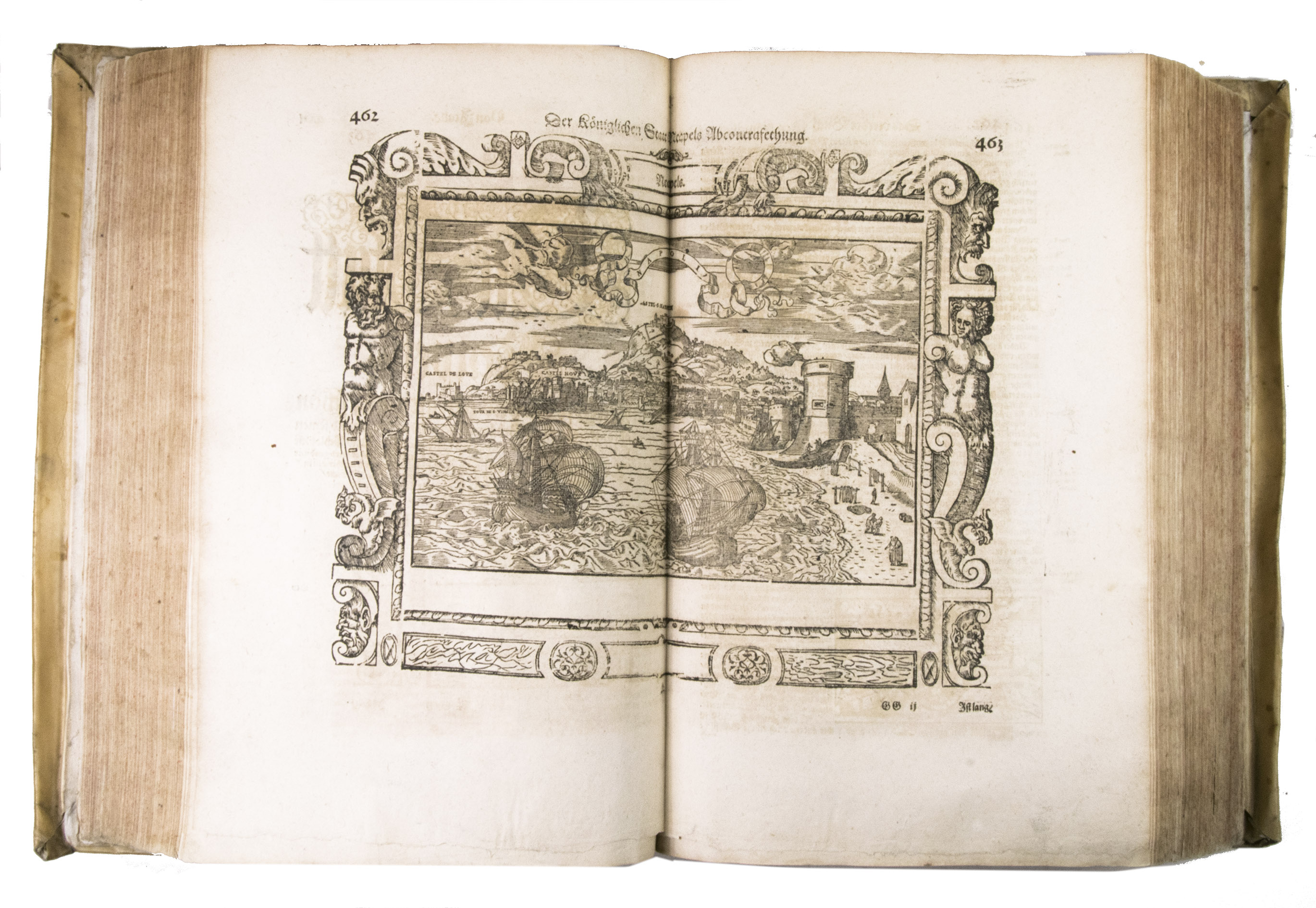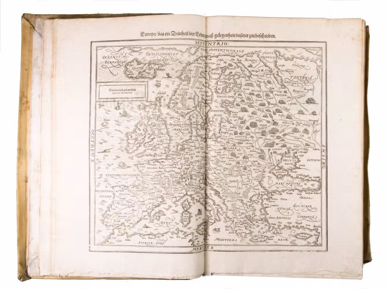 Basel, heirs of Sebastian Henricpetri, 1628. Folio (38 x 24.5 cm). With engraved title-page, letterpress title-page printed in red and black with woodcut portrait of Münster on the back, 26 numbered double-page woodcut maps on inserted bifolia, 72 double-page woodcut maps, plans and views on integral leaves, and about 1500 woodcut illustrations in the text (including repeats) showing maps, plans, views, plants, animals, monsters, etc. Contemporary vellum. [24], “1752” [=1748] , [12] pp.
