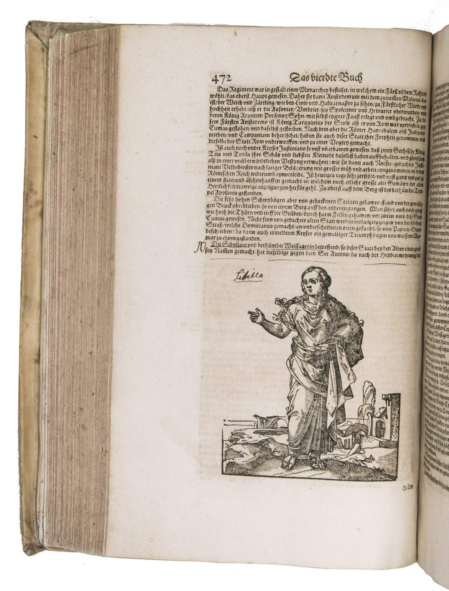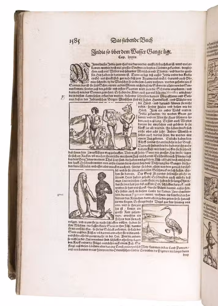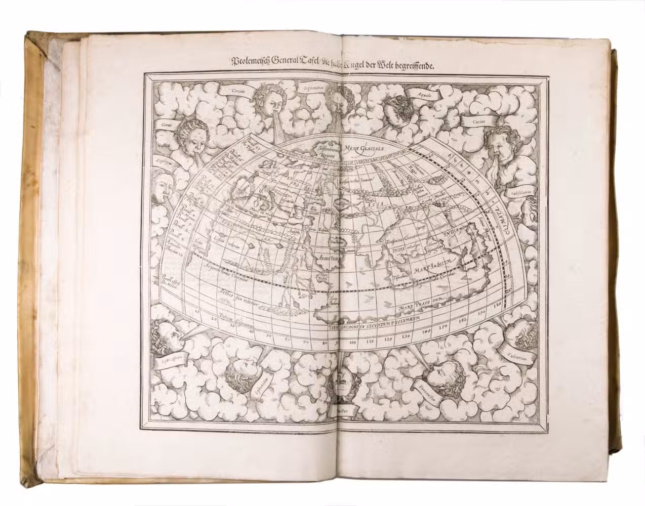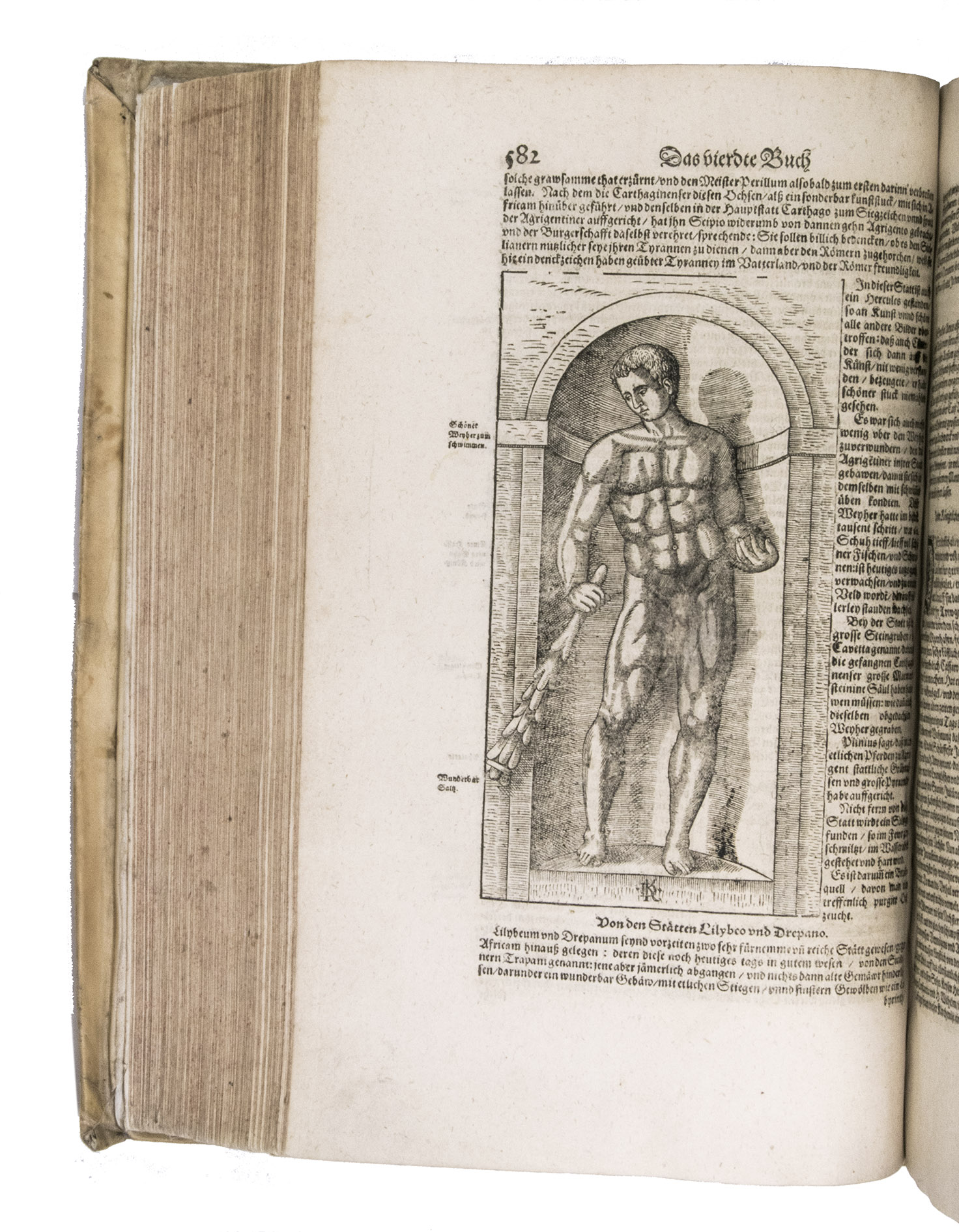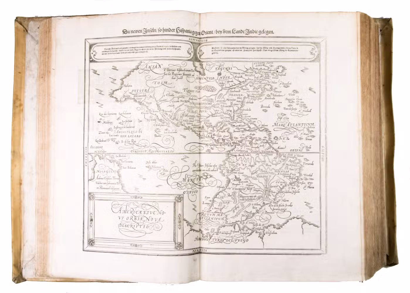 Basel, heirs of Sebastian Henricpetri, 1628. Folio (38 x 24.5 cm). With engraved title-page, letterpress title-page printed in red and black with woodcut portrait of Münster on the back, 26 numbered double-page woodcut maps on inserted bifolia, 72 double-page woodcut maps, plans and views on integral leaves, and about 1500 woodcut illustrations in the text (including repeats) showing maps, plans, views, plants, animals, monsters, etc. Contemporary vellum. [24], “1752” [=1748] , [12] pp.