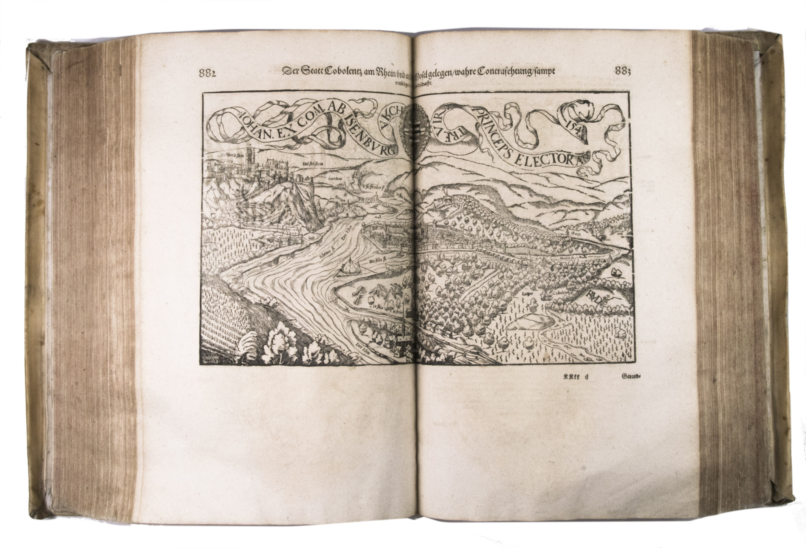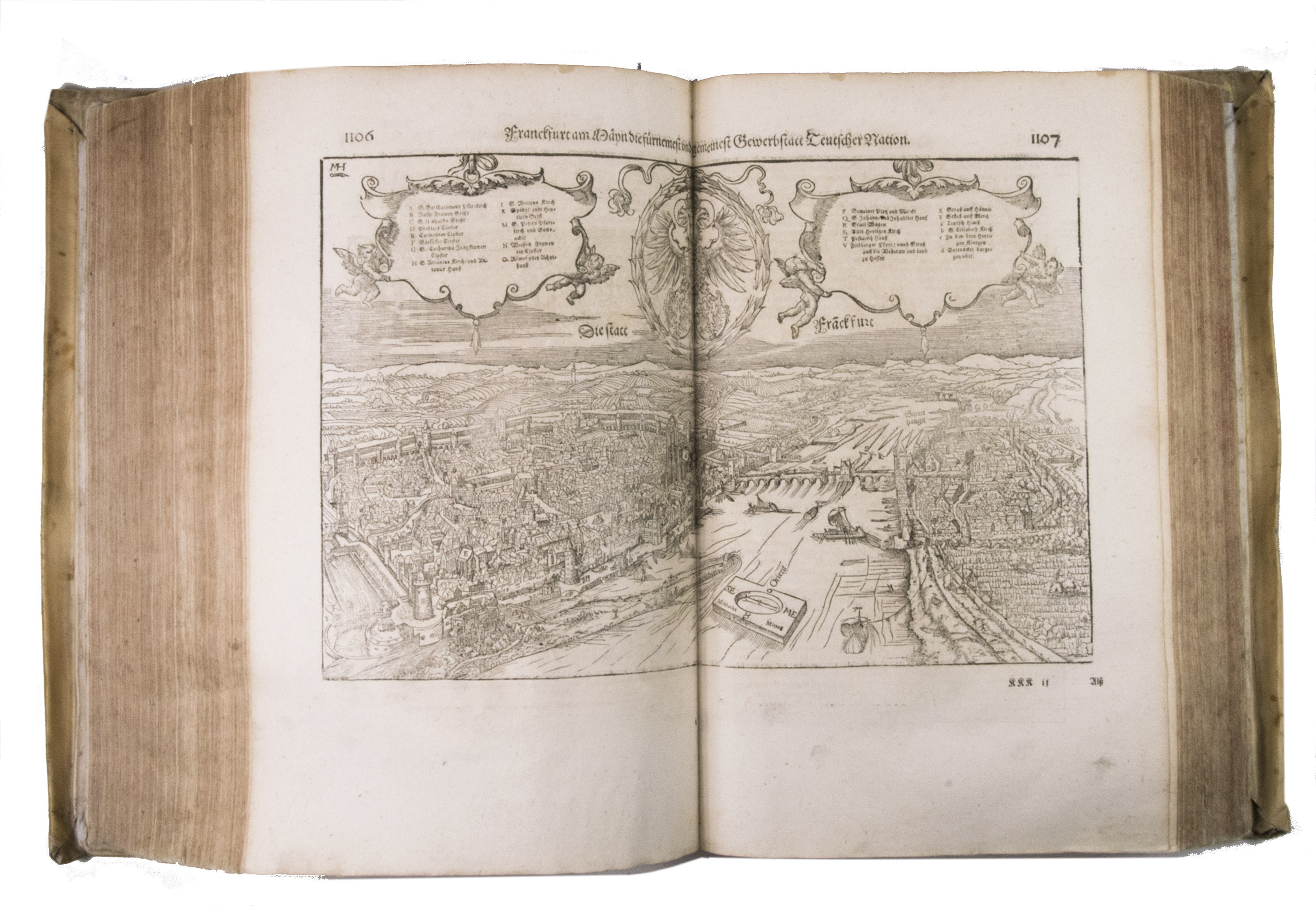 One leaf of the register restored affecting part of the text (replacement from a smaller copy of the 1614 edition), frontispiece reinforced in the gutter margin, some occasional thumbing and a few dog-eared leaves, otherwise a very good and clean copy, with the paper nearly untrimmed (tranchefiles still visible). Binding also very good, lacking the flyleaves. Sabin 51396; VD17 23:230709C (7 copies); cf. H.L. Ruland, "A survey of the double-page maps in thirty-five editions of the Cosmographia Universalis 1544-1628 of Sebastian Münster ..." in: Imago Mundi XVI (1962), pp. 84-97; for Münster: DSB IX, pp. 580-581.