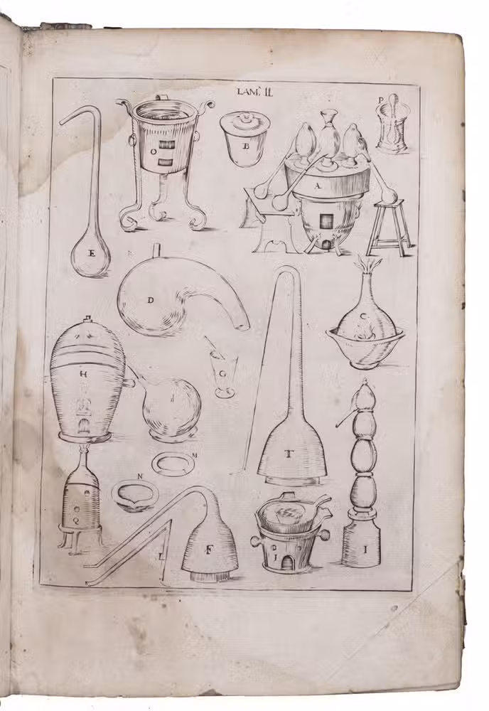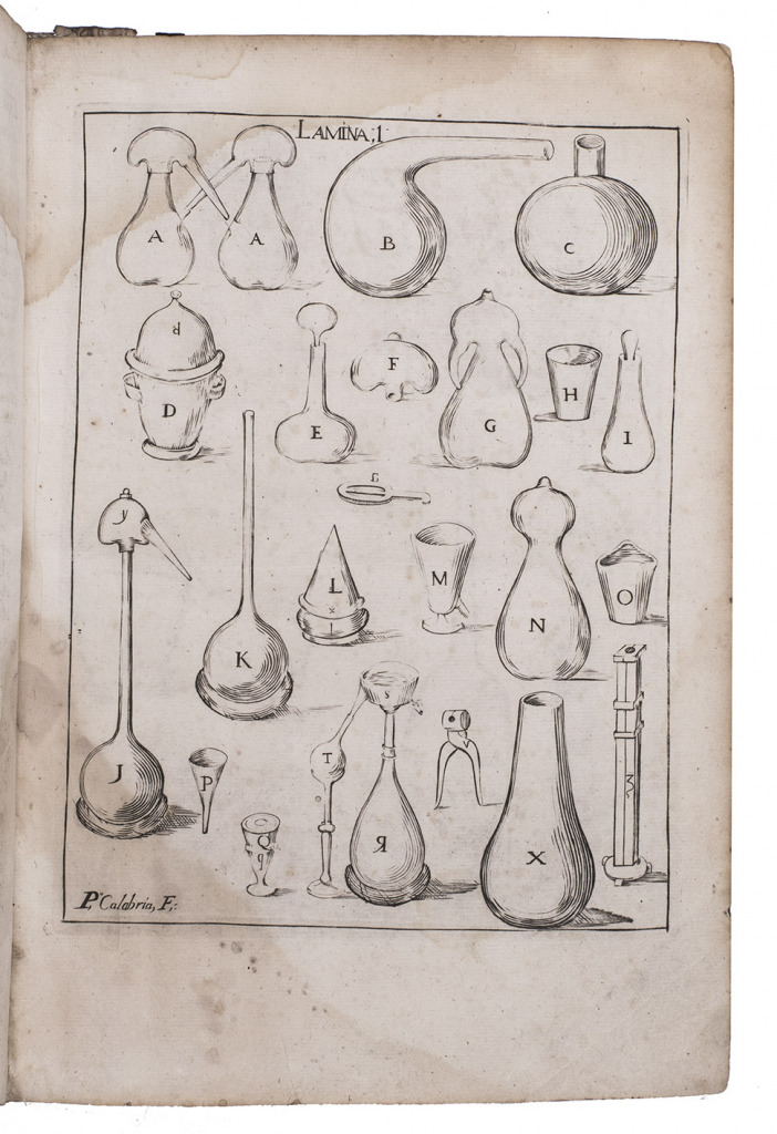 Rare fifth(?) edition, published in the year of the authors death, of a work on pharmaceutical chemistry written by the Spanish apothecary Félix Palacios (1677-1737). When the Palestra pharmaceutica appeared in 1706, it was the first work on the subject written in the Spanish language. Even though it became widely accepted and used in Spain, Palacios met strong resistance from his colleagues because he rejected the galenic, or plant based, medicines in favour of chemical medicines. With this he rejected the ideas of Galen, Mesue and Dioscorides, which were still the standard in most parts of Europe and the Middle East. The work starts with a preliminary text, followed by a chapter on the general principles of pharmacology and chemistry in the form of questions and answers. The other four chapters deal with the ingredients and making of the medicines. It discusses distillation and calcination methods with the engraved plates showing various tools and instruments: pots, furnaces, alambics etc.