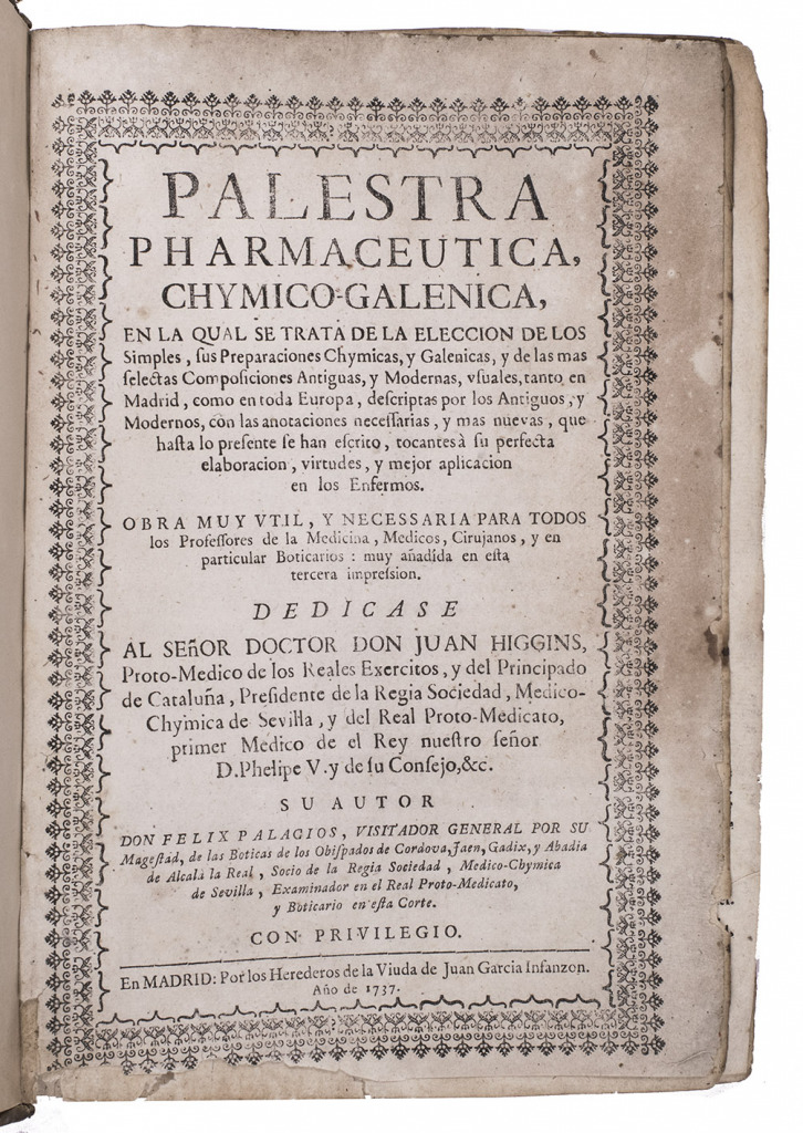Palestra pharmaceutica, chymico-galenica, en la qual se trata de la eleccion de los simples, sus preparaciones chymicas, y galenicas, y de las mas selectas composiciones antiguas, y modernas, usuales, tanto en Madrid, como en toda Europa, descritas por los antiguos, y modernos, con las anotaciones necesarias, y mas nuevas, que hasta lo presente se han escrito, tocantes à su perfecta elaboracion, virtudes, y mejor aplicacion en los enfermos. Obra muy util, y necesaria para todos los profesores de la medicina, medicos, cirujanos, y en particular boticarios; muy anadida en esta tercera impression.
