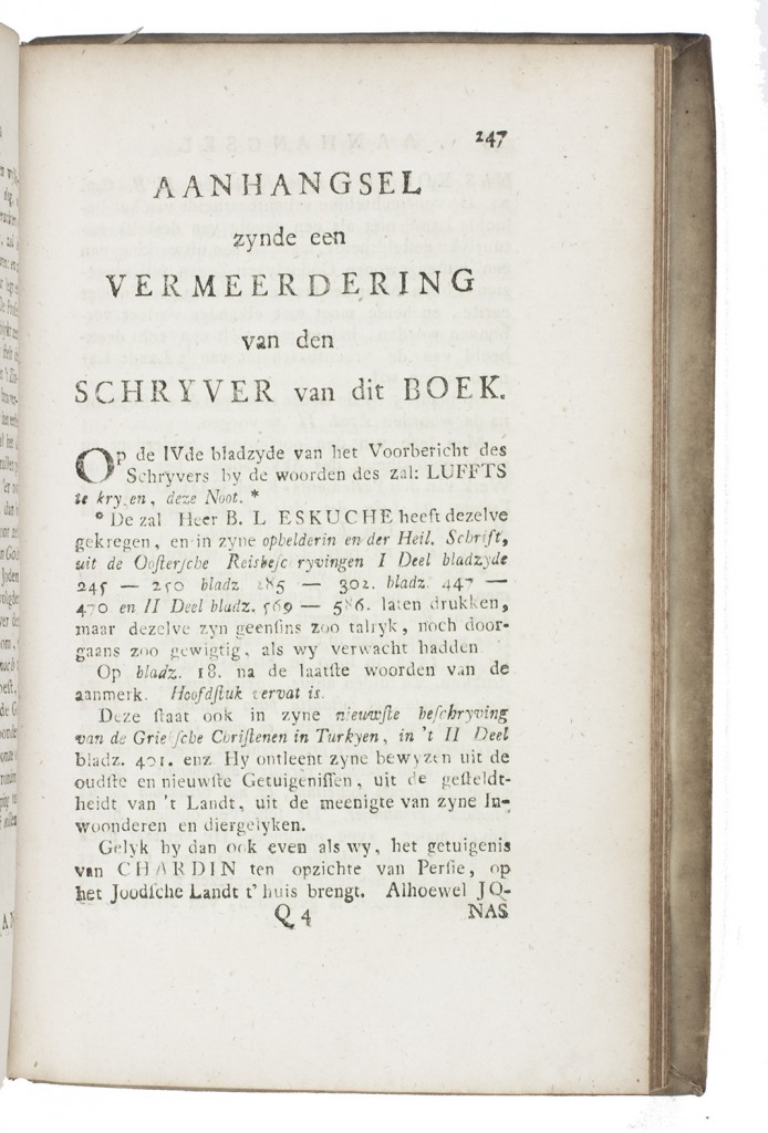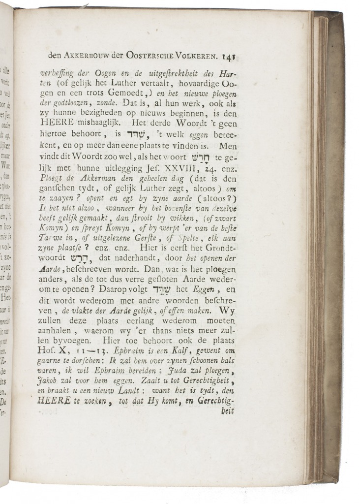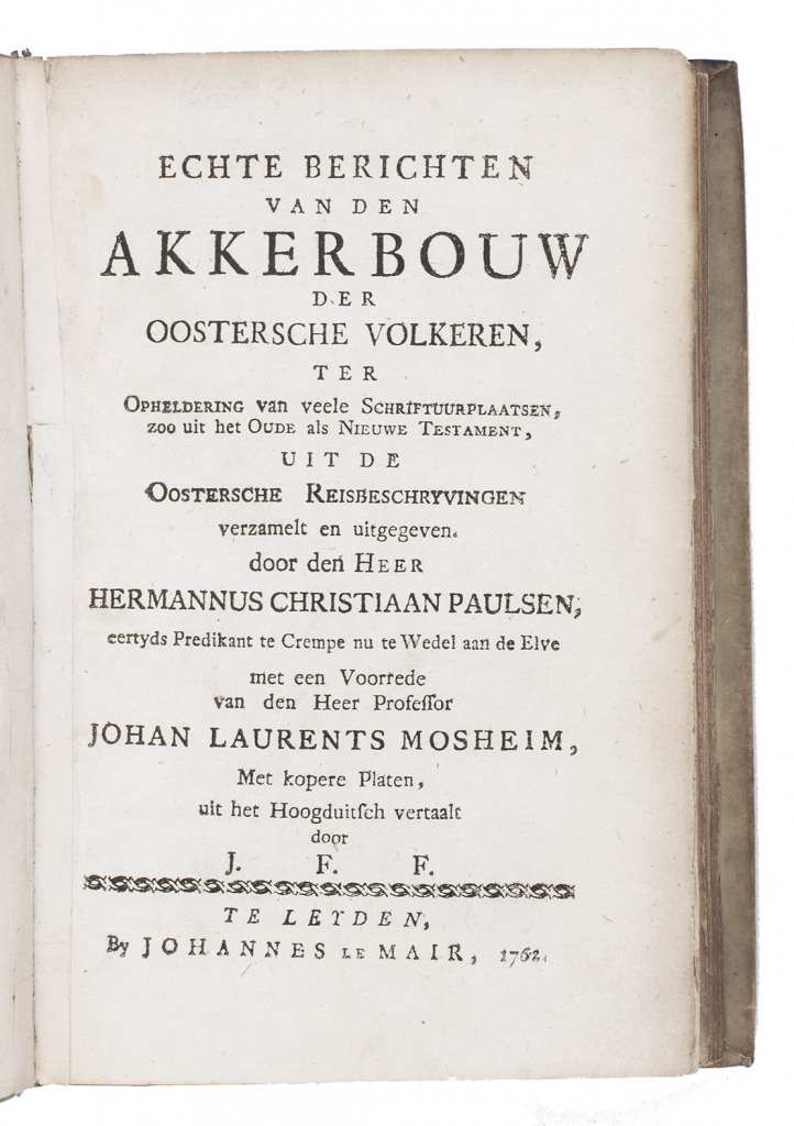 First edition of the Dutch translation of a work on agriculture in the Middle East, written by the German preacher Hermann Christian Paulsen (1718-1780). It covers the fertility of the soil, harvest season, plowing, sowing, etc. The plates show a plow and harvest and threshing methods. The author often refers to biblical passages and other writers (Chardin, Maundrell, Nieuhof and others) concerning agriculture and farming.
