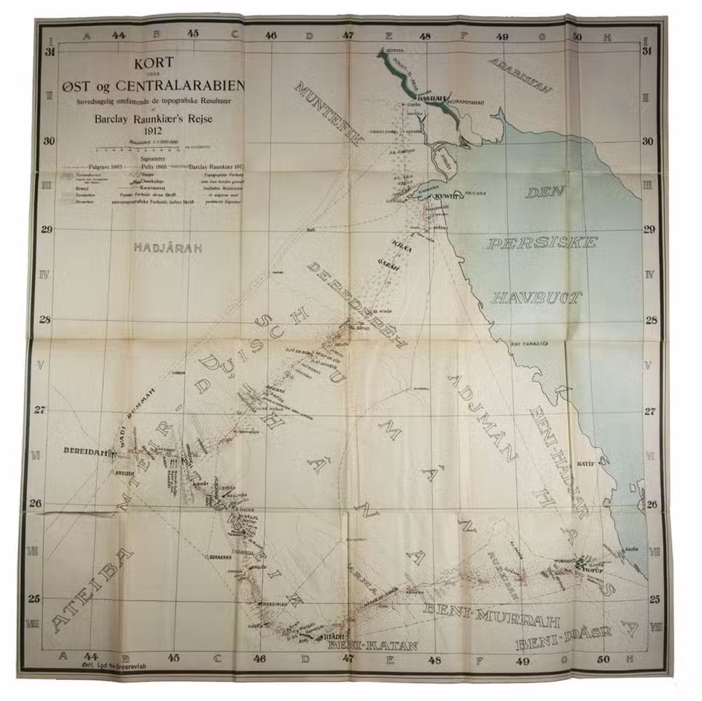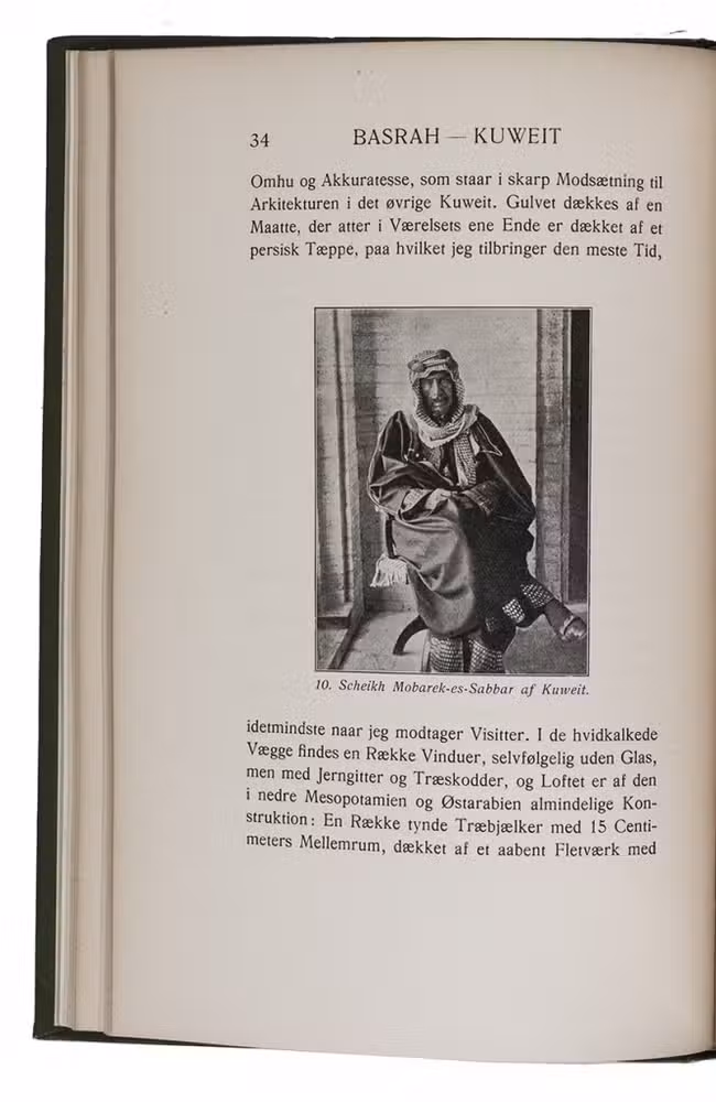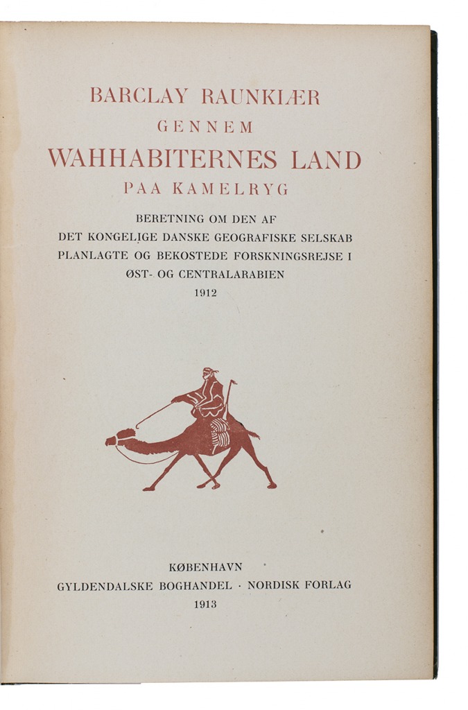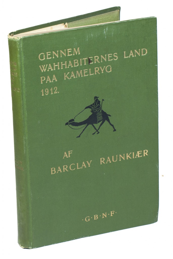 First and only edition, in the original Danish, of an account of a journey through the Arabian peninsula. Sponsored by the Royal Danish Geographical Society, Barclay Raunkiaer (1889-1915) set out to penetrate the hitherto unexplored deserts of south-east Arabia. Although he came equipped with a modest amount of scientific instruments and a camera, the use of these became almost impossible. The Arabs looked on foreigners with suspicion and Raunkiaer could use his camera only with great risk at certain unwatched moments (p. 12). At the beginning of 1912, he reached the town of Kuwait, where he stayed at the palace of Sheikh Mubarak. Since it was Mubarak's policy to keep Kuwait free of foreign interference, it took some active lobbying of the British envoy to convince the Kuwaitis that Raunkiaer was a harmless traveller. After that, it seems he enjoyed a certain amount of freedom, as numerous photographs testify, including one of pearl fishers and a portrait of Sheikh Mohammed. Raunkiaer was very impressed by the volume of trade in Kuwait, which he considered to be the most important trading centre on the east coast of Arabia.