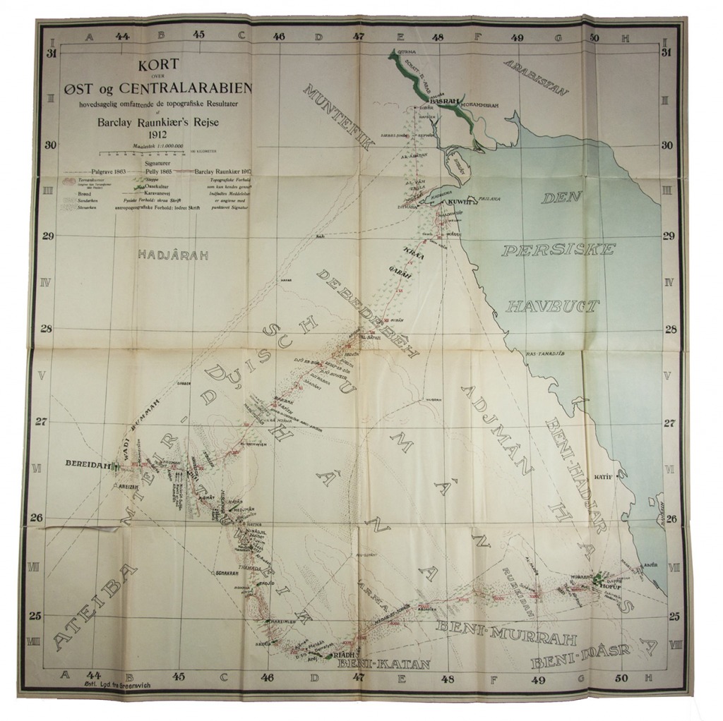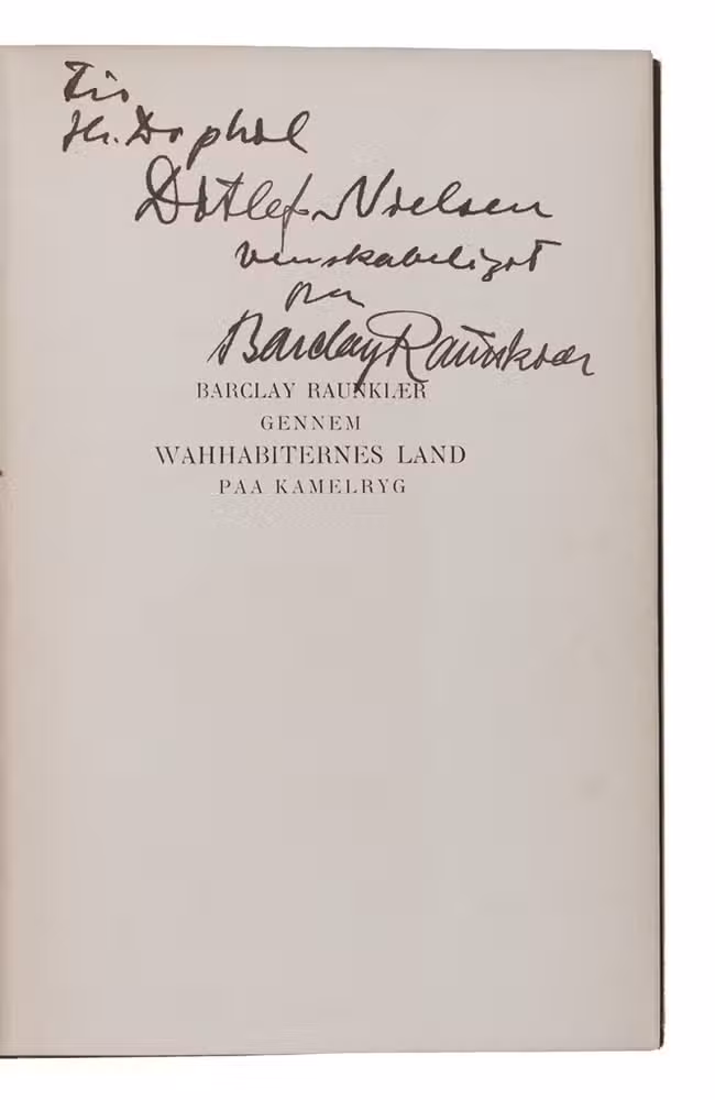 With a dedication by the author to the Danish historian of religion Ditlef Nielsen (1874-1949) and a few annotations in pencil in the final chapter. Binding slightly worn along the edges, with a small stain on the title. Endpapers foxed with the text browned; some small random pen marks at the lower margin of p. 47. The map with a few tears along the folds, most of them expertly repaired; a very good copy. Facey, Kuwait by the first photographers, pp. 50-51; "Danish expedition to Arabia", The geographical journal XLIV (1914), pp. 85-86.