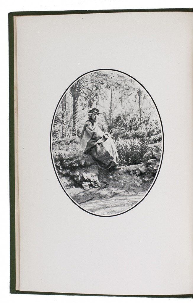 Copenhagen, Gyldendalske boghandel, Nordisk forlag, 1913. 8vo. With a frontispiece showing the author in Arab garb, 88 illustrations in text, most of them reproductions of drawings and photographs by the author, and a folding map loosely inserted in a pocket at the end. Publisher's green cloth. [1], [1 blank], [2], 304 pp.