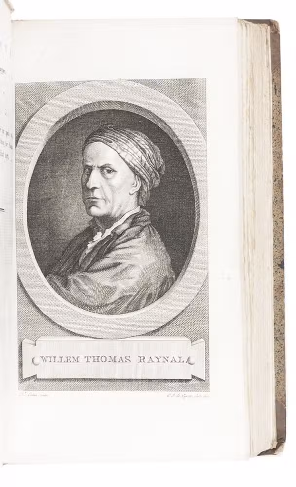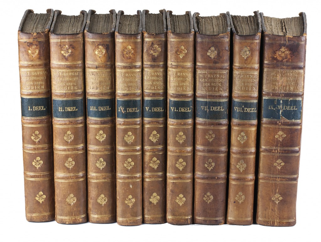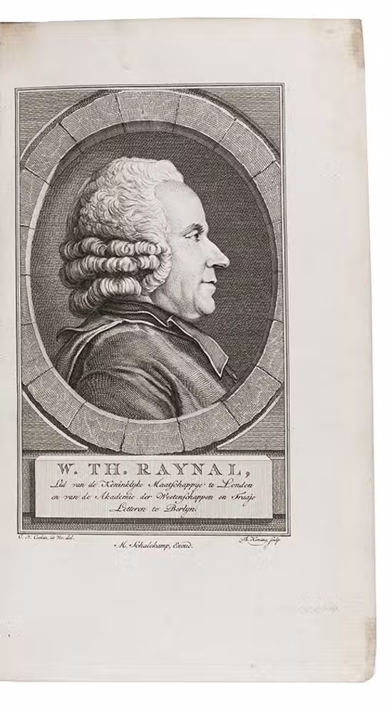 Second copy located, of the second edition of the Dutch translation of an extensive and widely published radical critique of European overseas expansion, written by the French author Guillaume Thomas François Raynal (1713-1796) in collaboration with figures associated with the Encyclopédie, above all the famous French philosopher Denis Diderot (1713-1784). The contents are partly based on travel accounts and data gathered from an unprecedented number of government documents, furnished by a network of officials and informants in all the colonial powers.