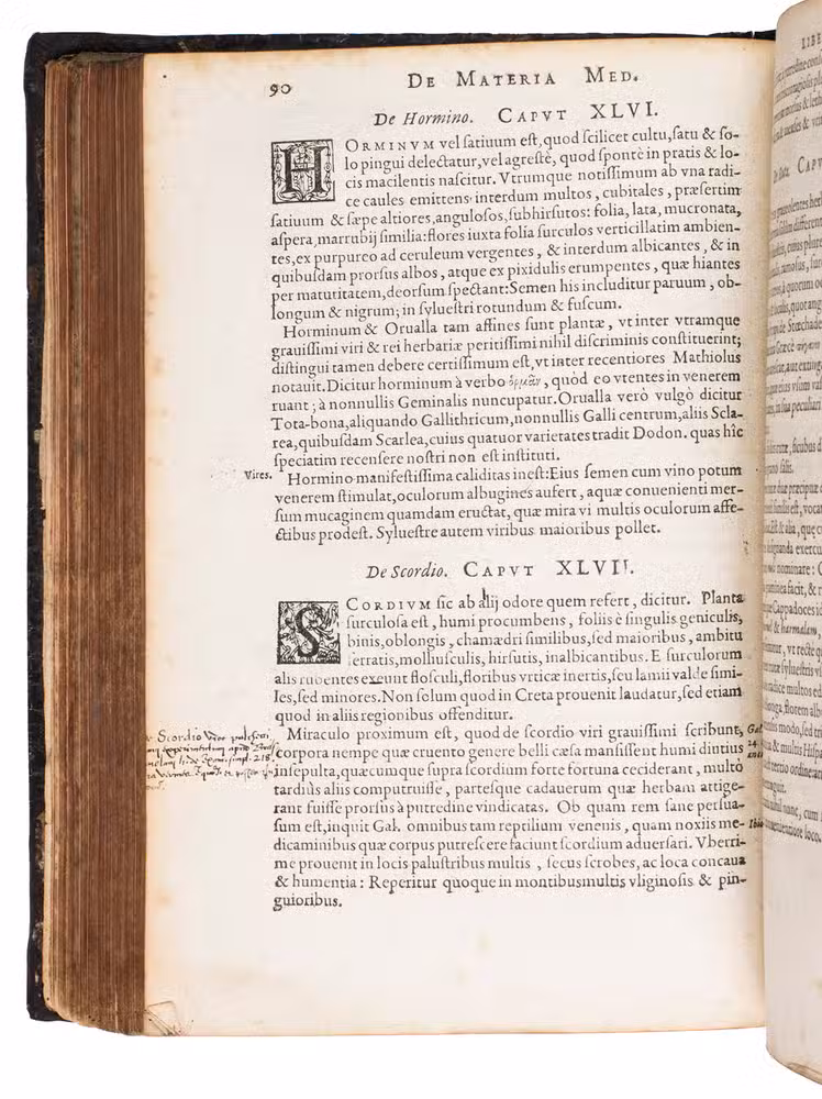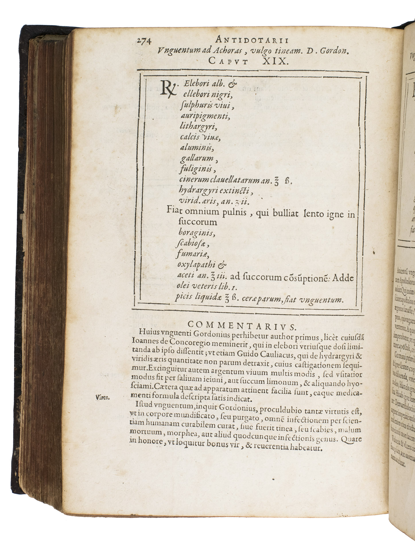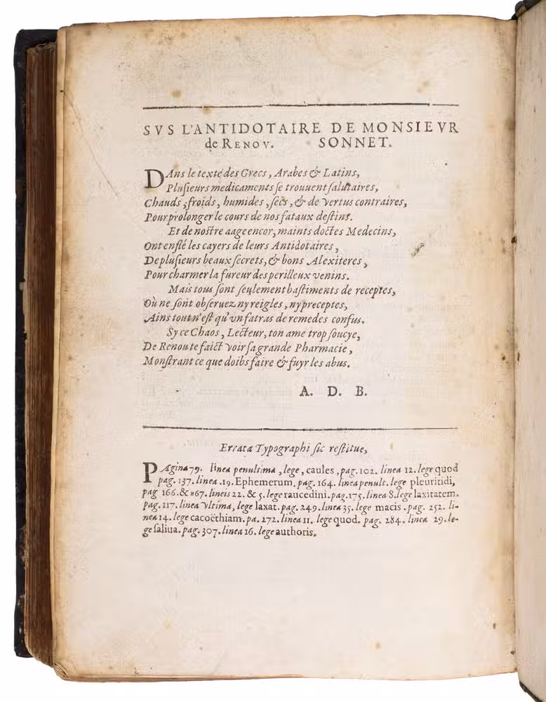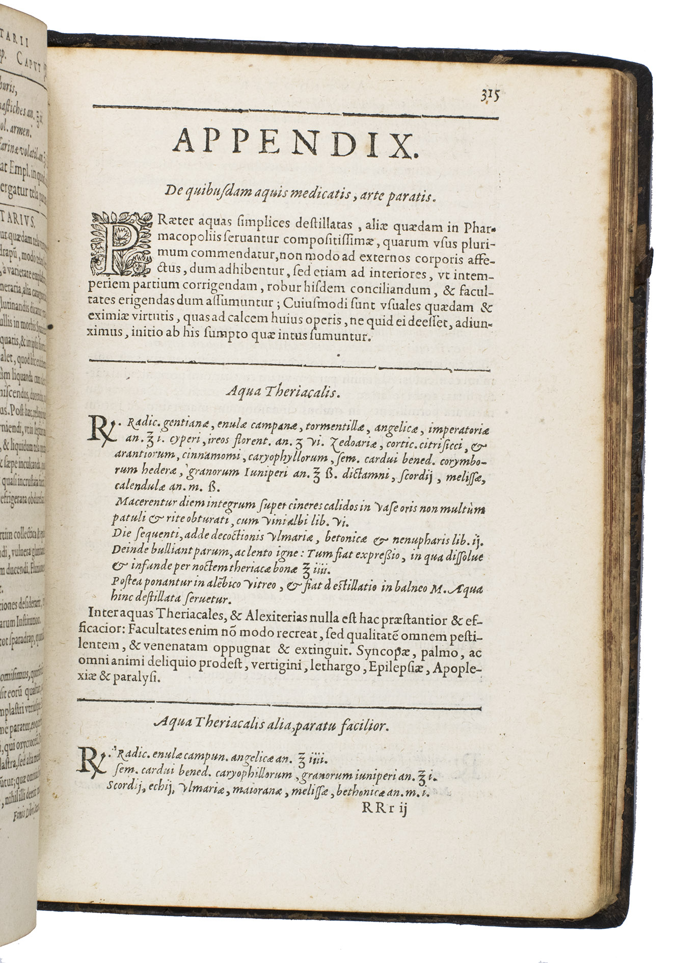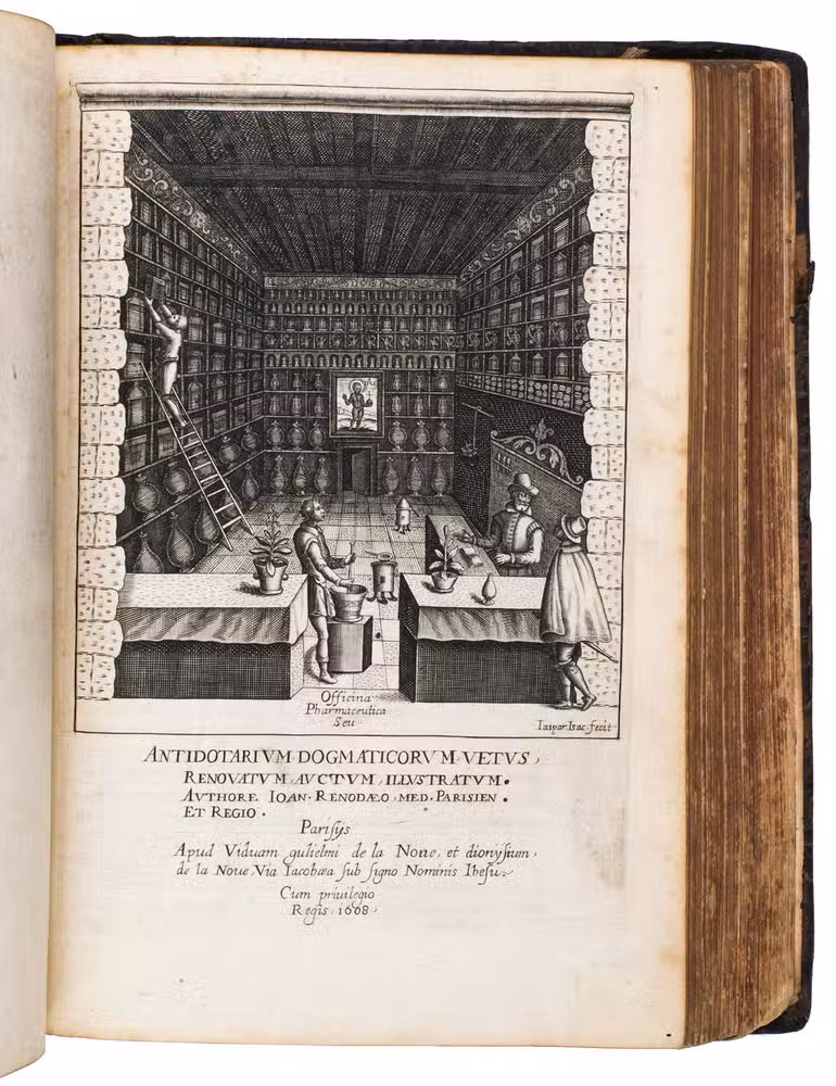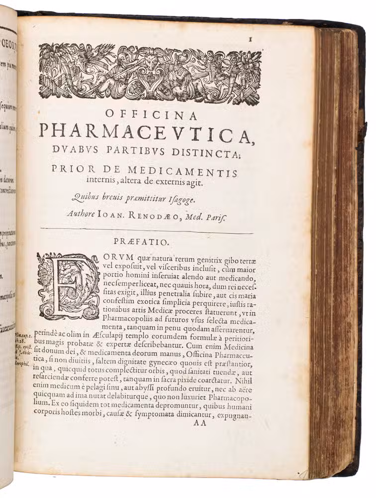 First edition of a comprehensive and influential medical work, written by the Parisian physician Jean de Renou (1568-1620). "Of particular influence on the practice of French pharmacy were the writings of Jean de Renou (1608), providing a formulary, a textbook, and a guide to the preservation of drugs, the use of pharmaceutical equipment and to the rules of professional ethics" (Sonnedecker). The work is divided into two parts, each with its own engraved part-title. The first part starts with some general chapters on the principles of pharmacology and what a proper apothecary is like. Several chapters follow on different types of medicines, their characteristics, how to compound them and when to prescribe them. Three large chapters cover the different ingredients and their medicinal powers, distinguishing between plants, minerals and parts of animals. Whereas the first part is more introductory and informative, the second part is more like a pharmacopoeia. It gives many recipes for medicines, with comments on the diseases or ailments they're supposed to cure.