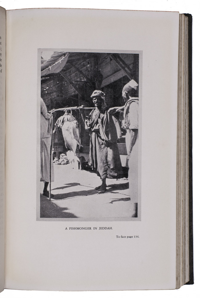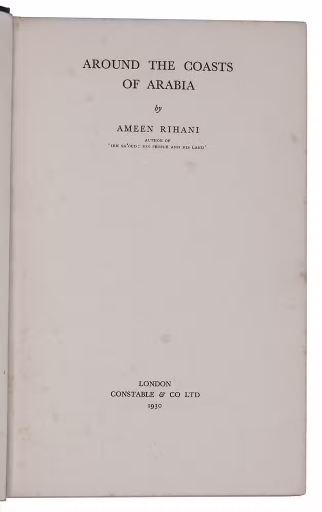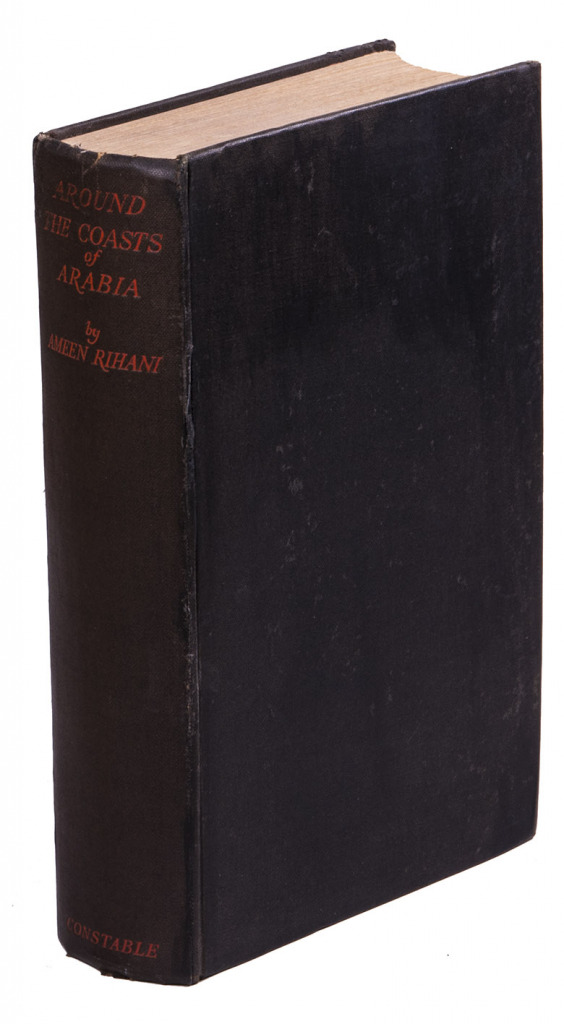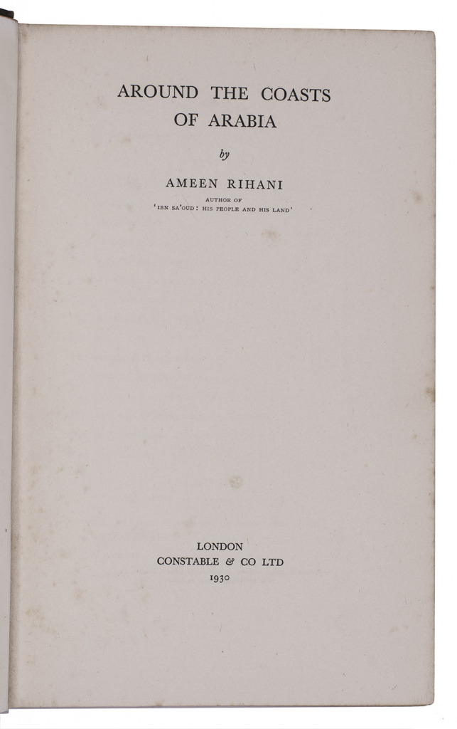 First edition, British issue, of a travelogue by the distinguished Lebanese Arab-American writer Ameen Rihani (1876-1940). This work is part of a trilogy: Around the Coasts of Arabia (1930), Arabian Peak and Desert: Travels in Al-Yaman (1930) and Ibn Sa'oud of Arabia: his people and his land (1928). Divided into 5 parts, in Around the Coasts of Arabia Rihani describes his time with King Husein in the Hijaz, the Idrisi in Asir, Aal Sabah, the sheiks of Kuwait, Aal Kalifah, the sheiks of Bahrein, and Aden and the protectorates. It is one of the most important sources for the historical background of the Idrisid Emirate of Asir.