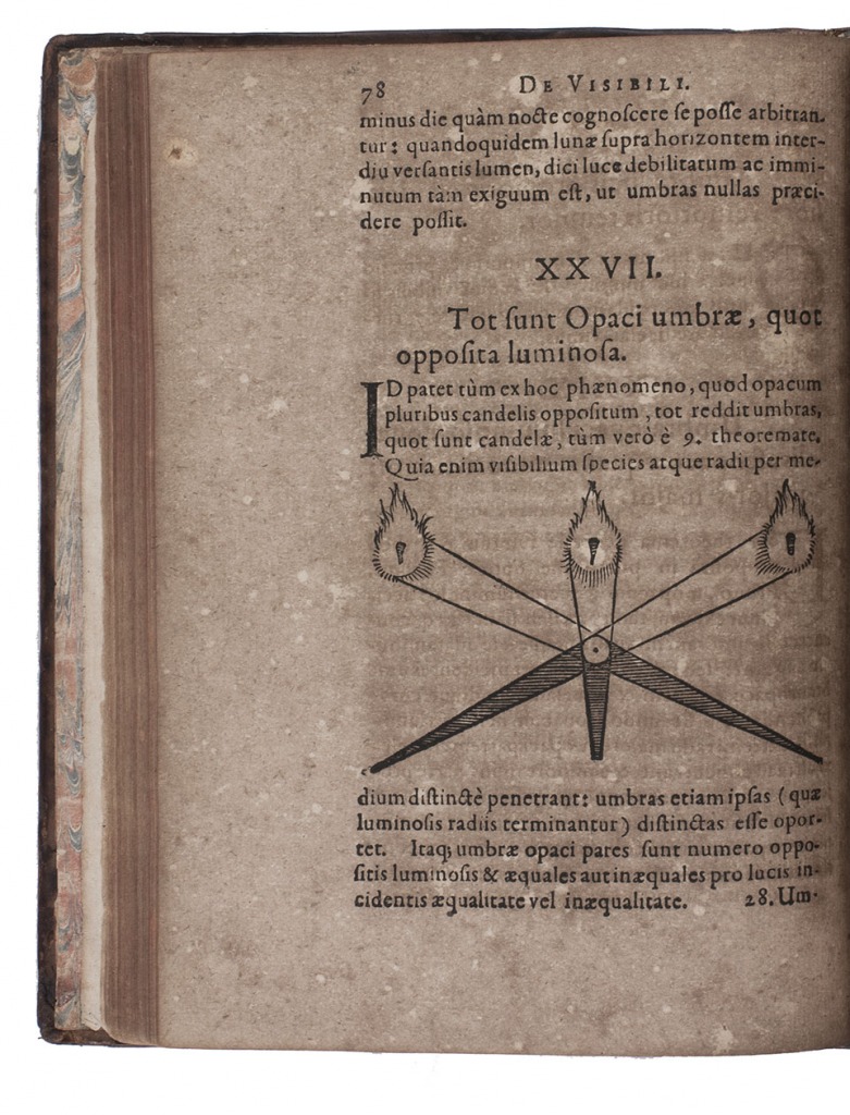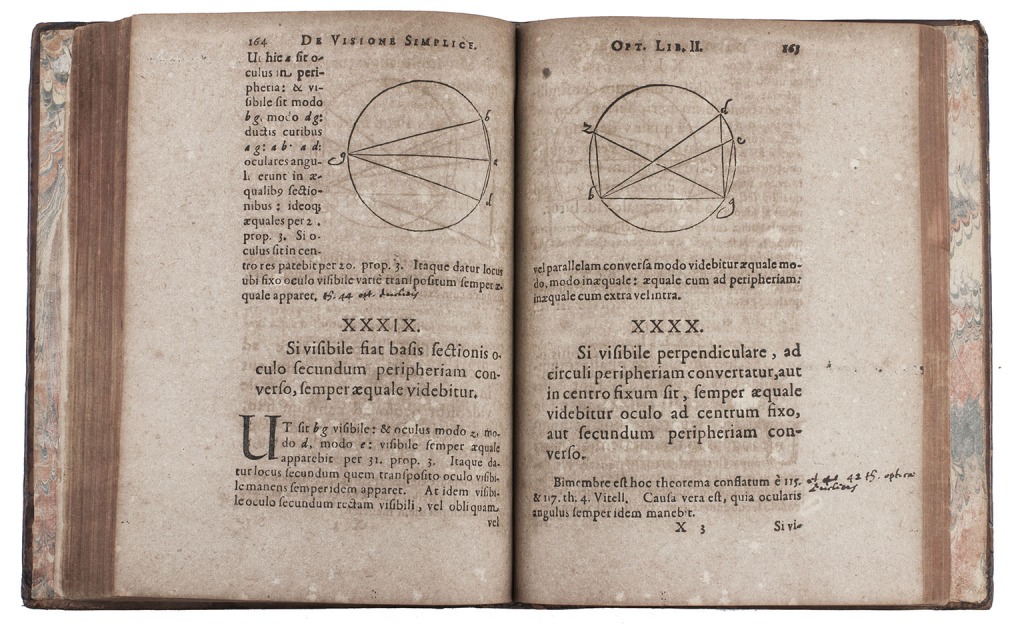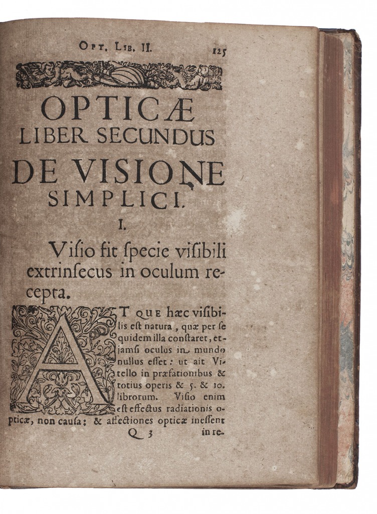 Kassel, Wilhelm Wessel (sold by Johann Berner in Frankfurt), 1615. 4to. With numerous optical, astronomical and mathematical woodcut diagrams in text, woodcut headpieces, tailpieces and initials, and headpieces built up from cast fleurons. 18th-century tan calf, gold-tooled double fillets, re-backed in sheepskin. [20], 259, [1 blank] pp.