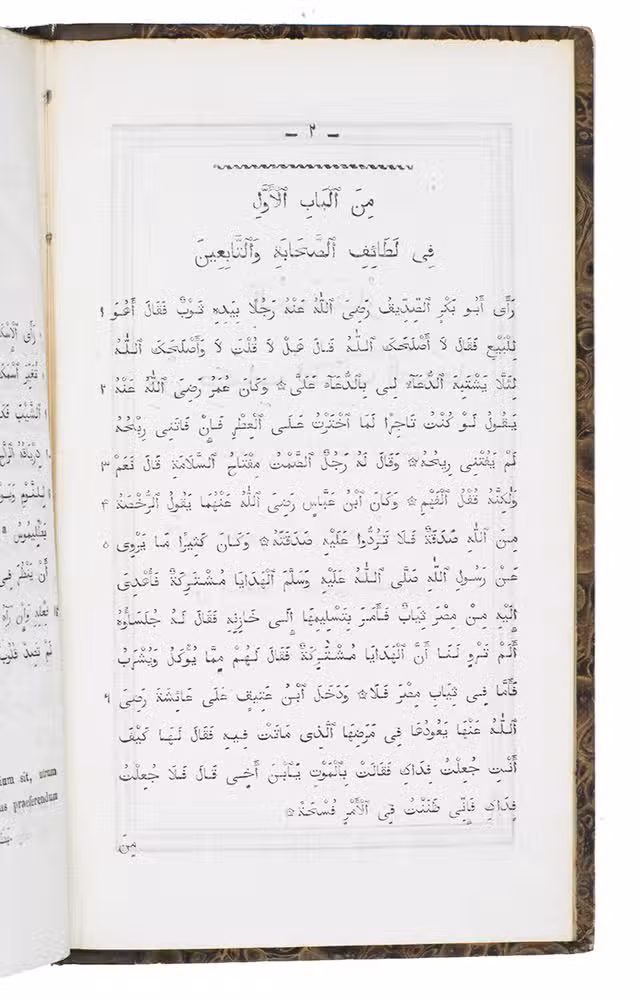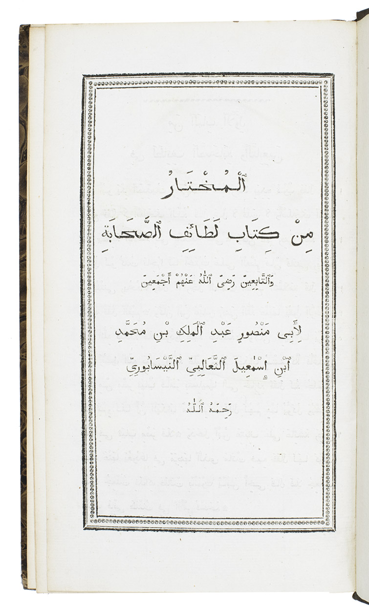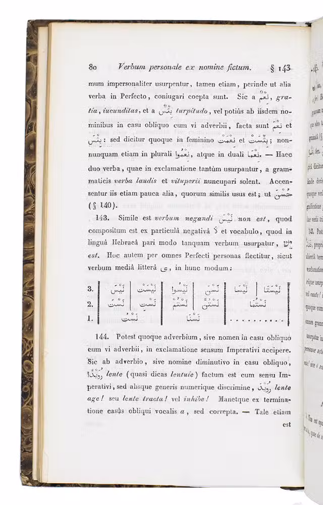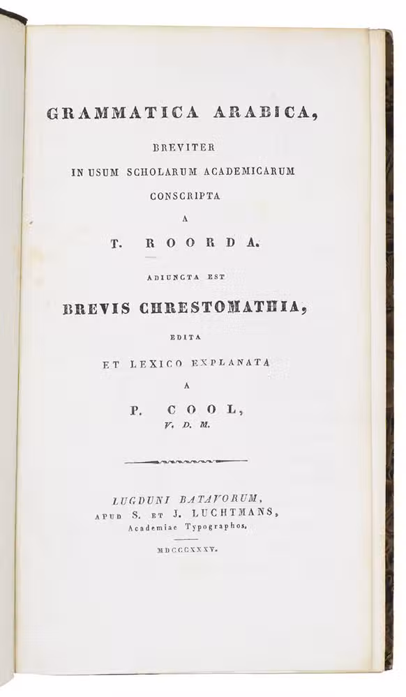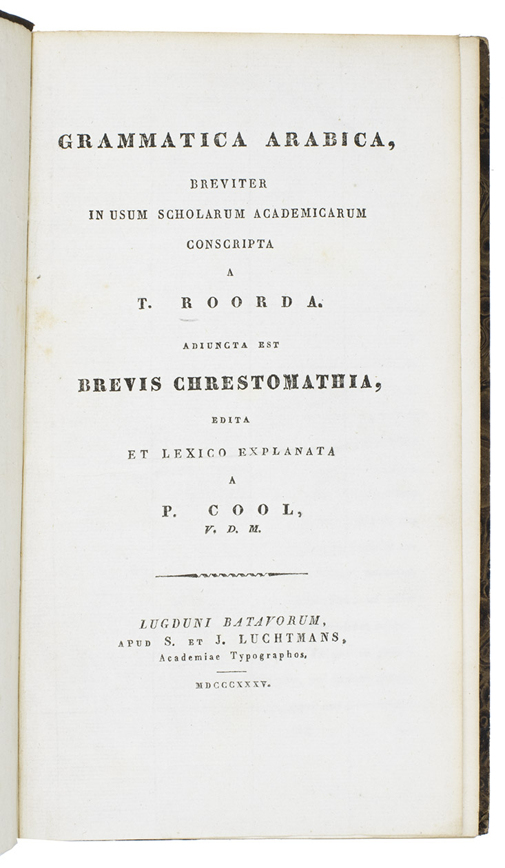 First edition of an Arabic grammar by the Dutch professor of oriental languages Taco Roorda (1801-1874), followed by a lexicon based on the writer Al-Tha'alibi (961-1038) and an Arabic chrestomathy by P. Cool. Roordas grammar was published to replace a work by Thomas Erpenius (1584-1624) with the same title, which had been the first accurate European work on Arabic grammar.