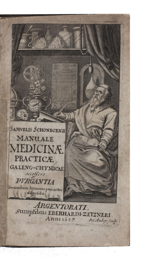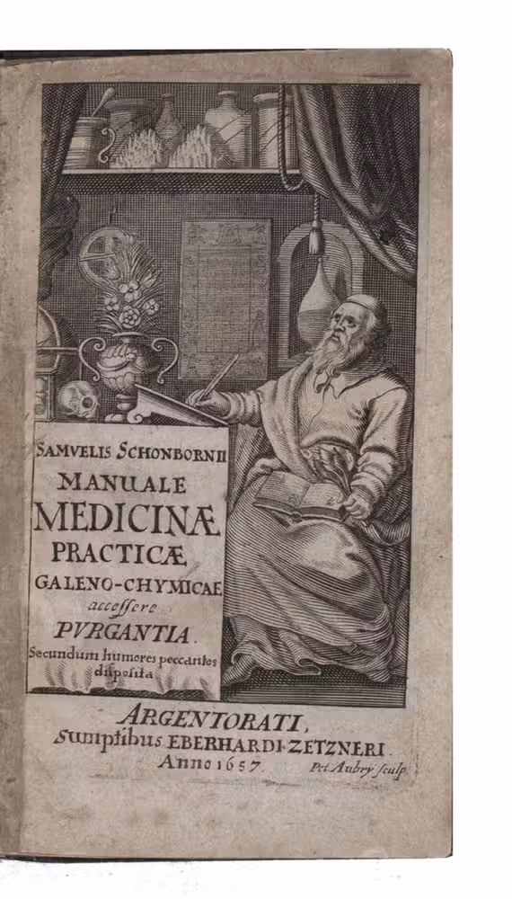 Second(?) edition of a rare manual on Galenic medicine, written by Samuel Schönborn (1608-1664), physician at Danzig (Gdansk). The main part of the work lists various diseases, aches and ailments, followed by several ingredients for medicines. The preliminaries include a note from the publisher and a note from the author.