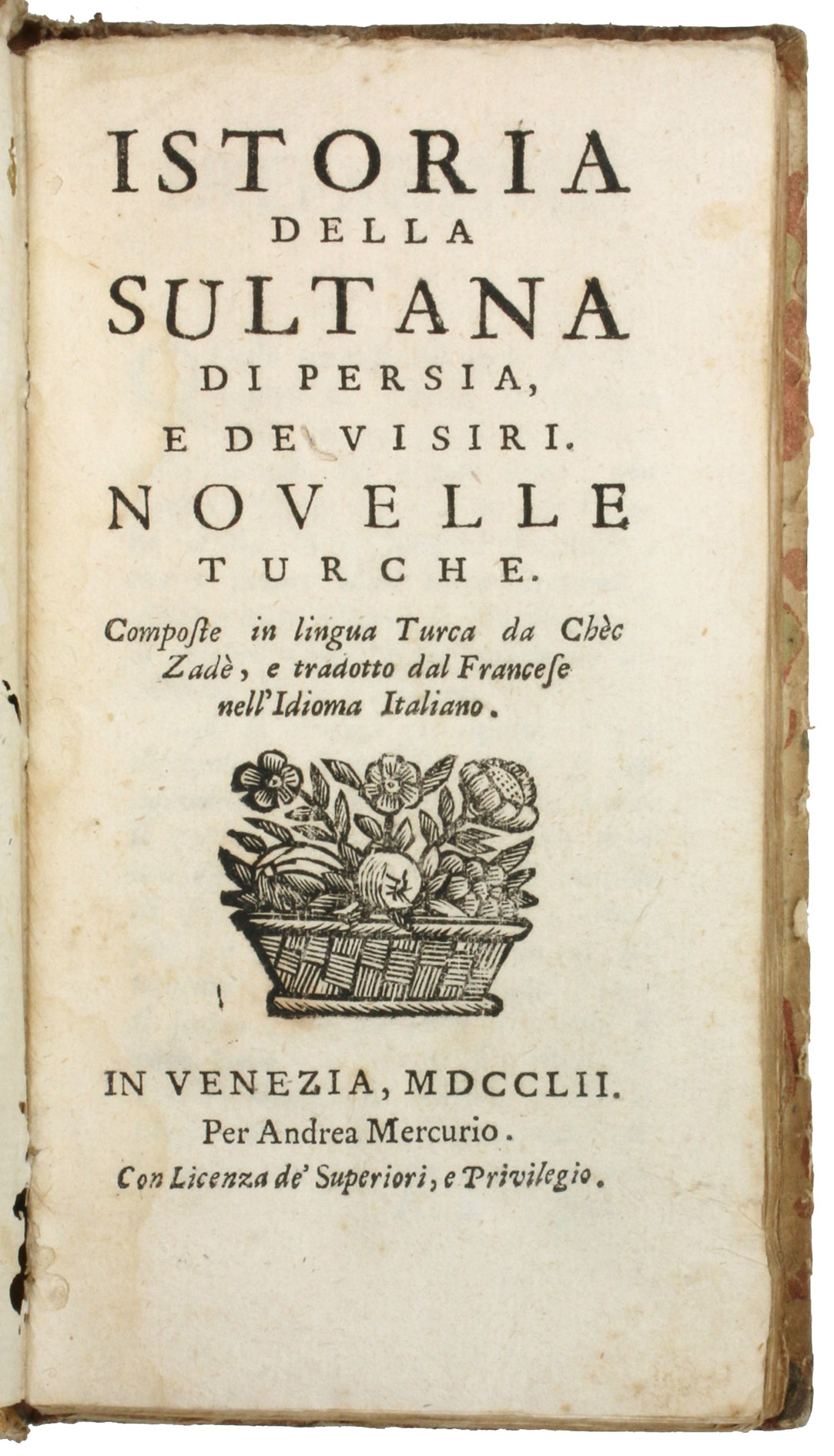 Second Italian edition of this important collection of oriental tales now known as the "Forty Viziers", first published in Italy in 1728. The first western edition, in French, appeared three years after Gallands first edition of the Arabian Nights, following its characteristic frame-narrative structure. It echoes the Biblical story of Potiphars wife, concerning a young prince who refuses the advances of his stepmother, who then denounces him to the sultan. The prince is put on trial, by means of alternate tales told by the sultana and the forty viziers. Petis de la Croix (1653-1713), dragoman to Louis XIV, attributes the Turkish original to one Chéc Zadé (Shaikhzade Ahmed Misri), tutor to the Ottoman ruler Murad II (r. 1421-51), but it is now thought that that the tales date back to an Arabic original which is no longer extant, possibly written in Egypt for the Turkic ruler al-Ikhshid (r. 935-946), and that two writers were involved in its production: "an Ahmed-i Misri [Ahmed the Egyptian] who translated the work from Arabic and presented it to Murad II, and a Sheykh Zade who took up the text later, presenting it to both Murad II and Mehmed II" (Burrill, "Sheykh-Zade", in Encyclopaedia of Islam, 2nd).