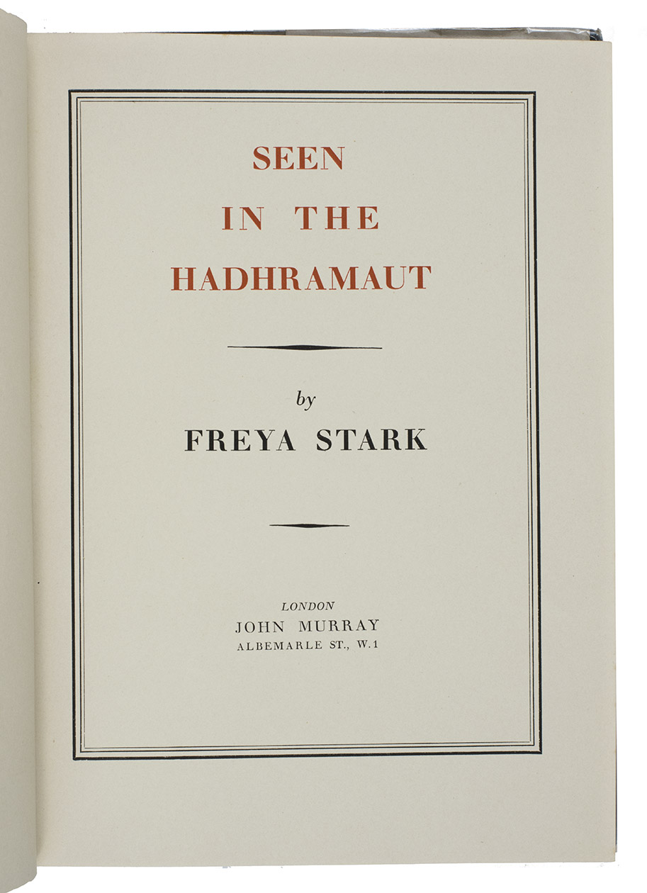 Dust jacket is slightly soiled and very slightly damaged (mostly around head and foot of spine), binding and edges with some slight discolouration and foxing, endleaves partially browned. Blackmer 1470; Howgego IV, S61; Smith, The Yemens, 98; Sotheby's the library of Robert Michael Burrell, 889. cf. "Freya Stark". Encyclopaedia Britannica; (other ed. 1939) Macro 2118; Shapero, The Islamic World (2003), 468.