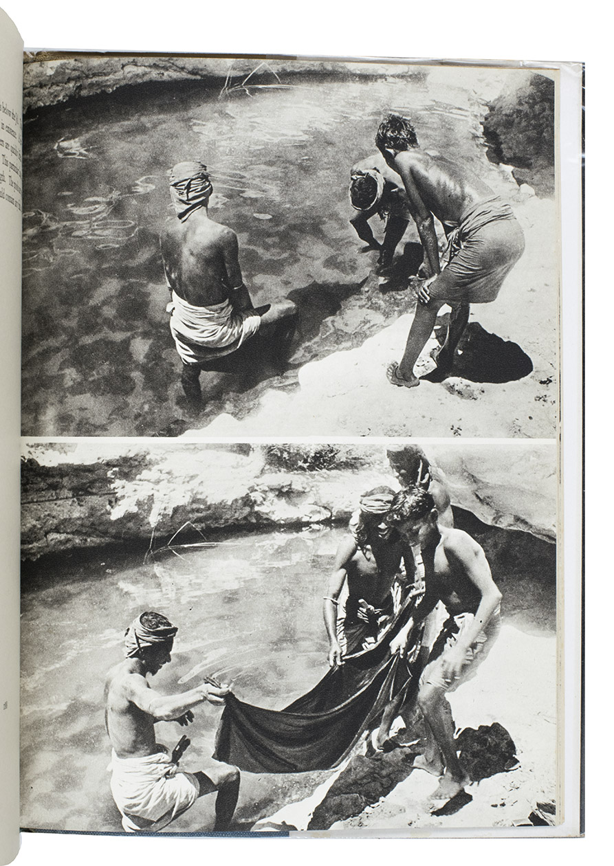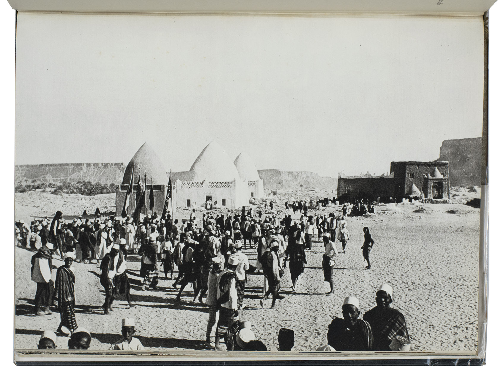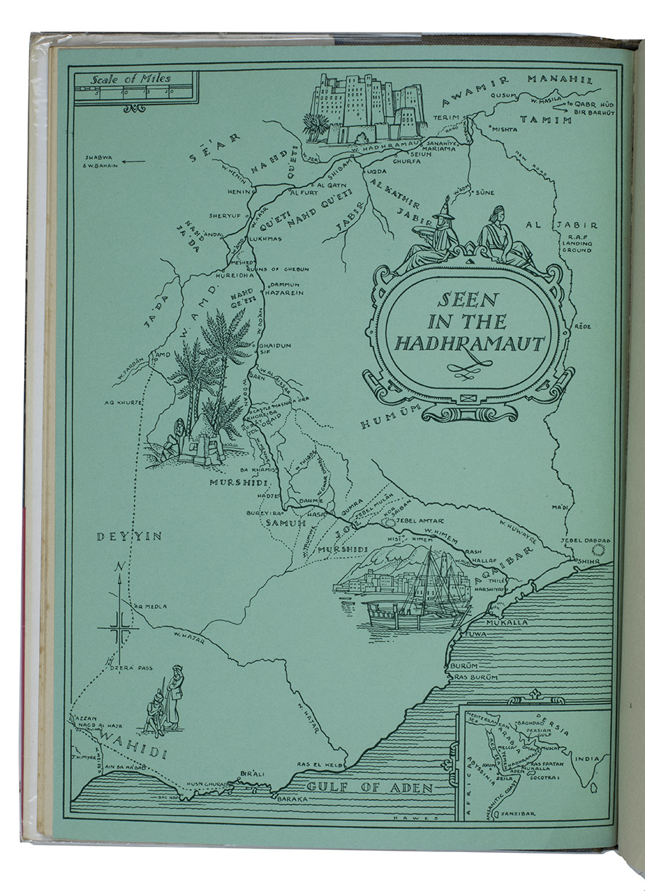 London, John Murray, 1938. 4to. With the title-page in red and black, 1 map of the Hadhramaut titled: "Seen in the Hadhramaut", and 50 double sided plates. The plates are included in the pagination. Blue cloth with black lettering on front cover and spine. With dust jacket. XXIII, [1 blank], 199, [1 blank] pp.