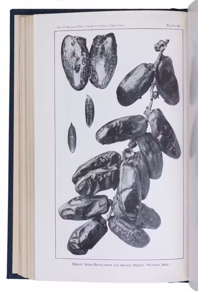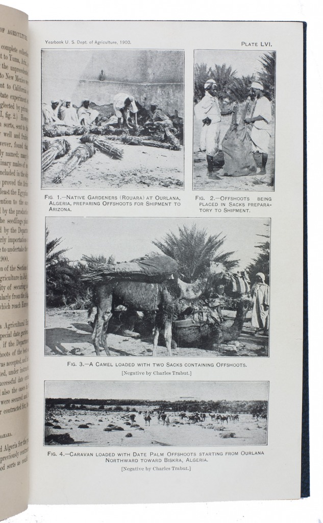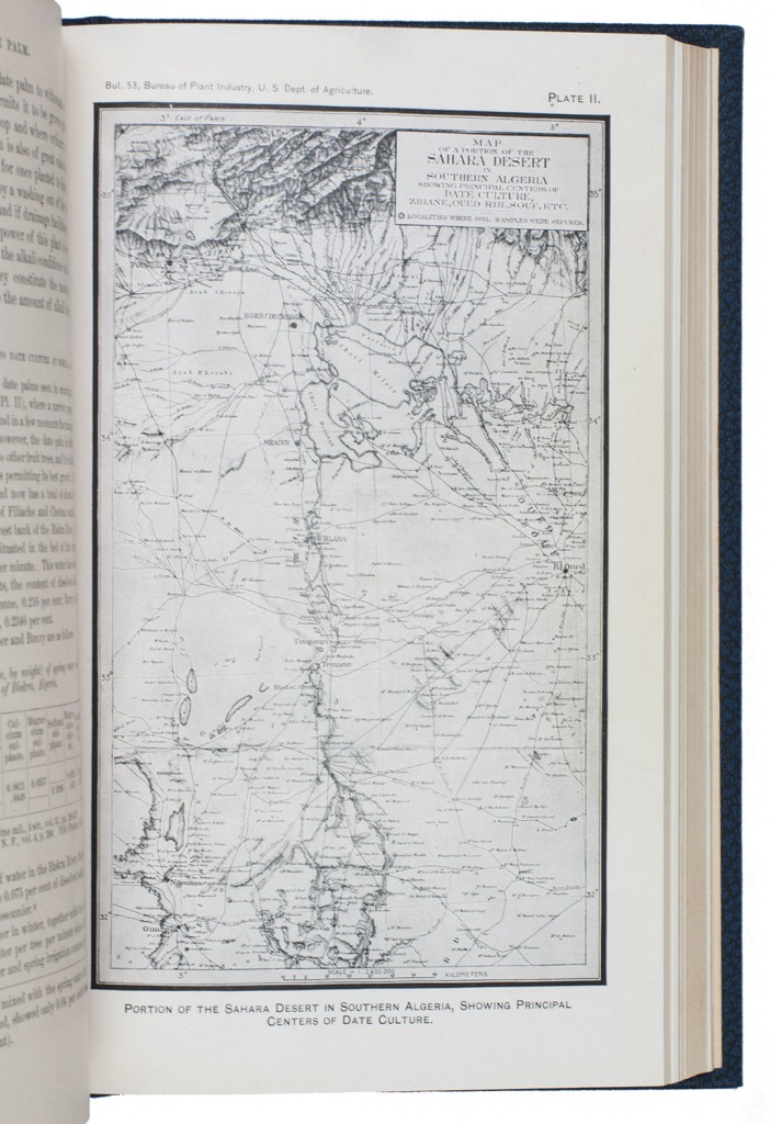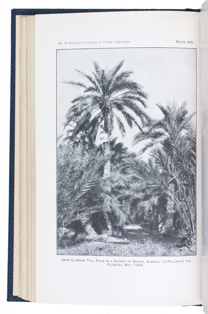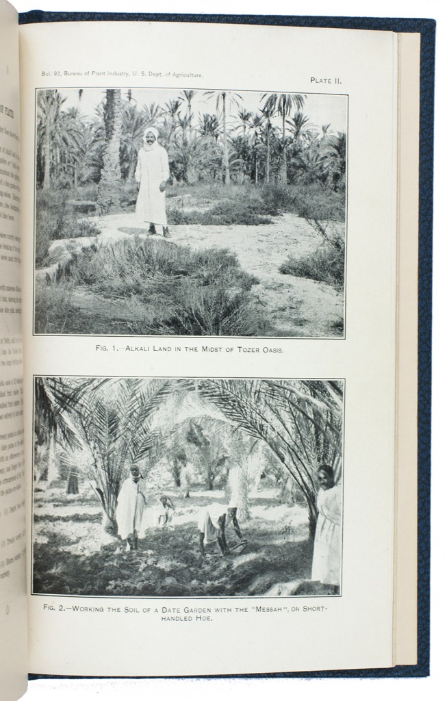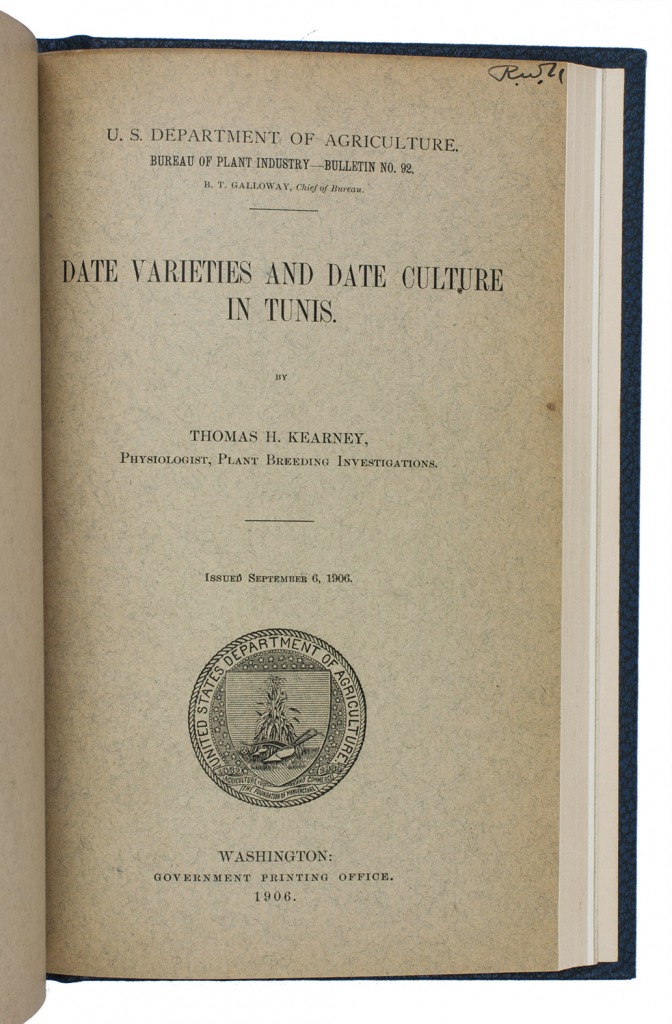 Ad 1: Offprint of an article on the date palm in America by the American botanist Walter Tennyson Swingle (1871-1952). He describes the characteristics of the date palm, its history in America, its cultivation, commenting on the proper climate, irrigation, fertilizing, soil, etc., and the uses of its fruits.Ad 2: First edition of Bulletin no. 53 of the USDA Bureau of plant industry, devoted to the date palm growing in the south of America, also by Swingle. It deals again with the cultivation of the tree, but in much more detail than in ad 1. A large part is devoted to the trees resistance to alkali, comparing alkali conditions in Algeria and America. Besides many photographs, it includes two chromolithographed maps of California showing where the date can grow and showing the variation in soil.Ad 3: First edition of Bulletin no. 54 of the USDA Bureau of plant industry, being a brief article on the introduction of date trees from the Arabian Gulf to America, written by the American botanist David Fairchild (1869-1954). He distinguishes many varieties of the palm growing in the Middle East (Bagdad, Basra, Al-Hasa, Masqat and more).Ad 4: First edition of Bulletin no. 92 of the USDA Bureau of plant industry, on different date palm varieties growing in Tunisia by Thomas Henry Kearney (1874-1956). He gives a description of geography, climate, the cultivation of the tree in Tunisia, the different types of dates and fruits and their characteristics.