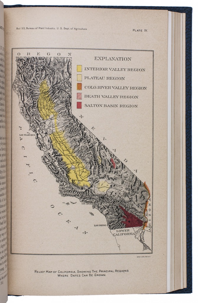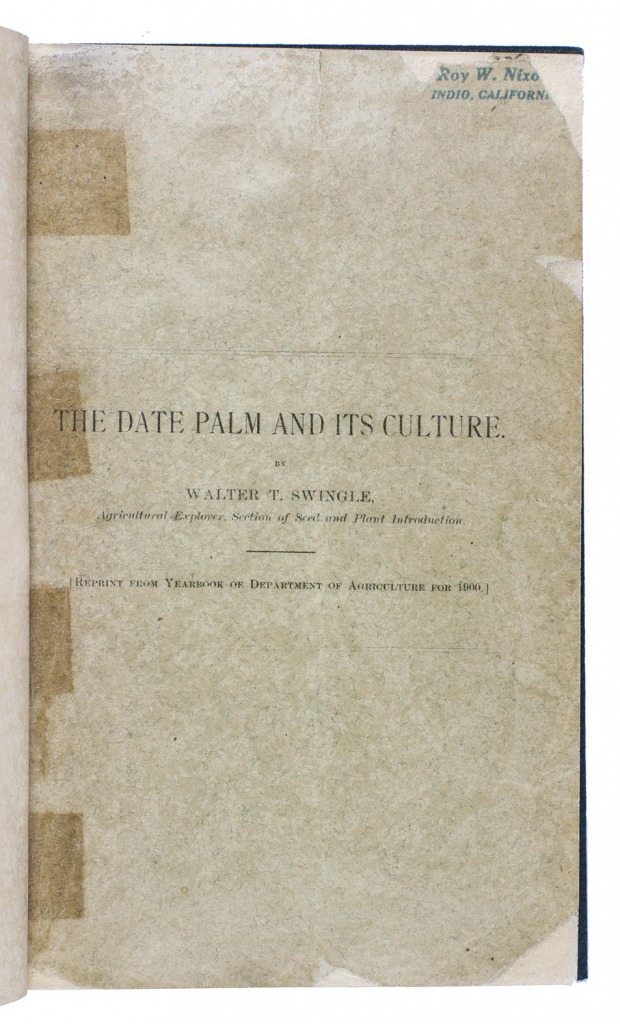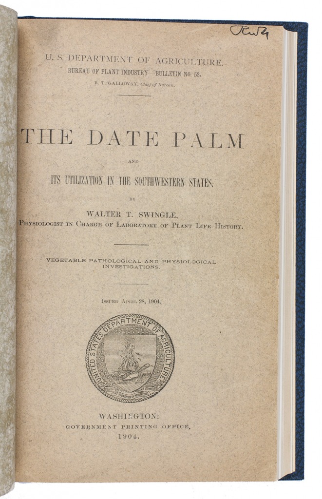 (2) SWINGLE, Walter Tennyson. The date palm and its utilization in the southwestern states.Washington, Government printing office, 1904. With a wood engraved device of the United States department of agriculture on title-page, 21 (of 22) plates (including 2 chromolithographed maps) and 10 illustrations in text.