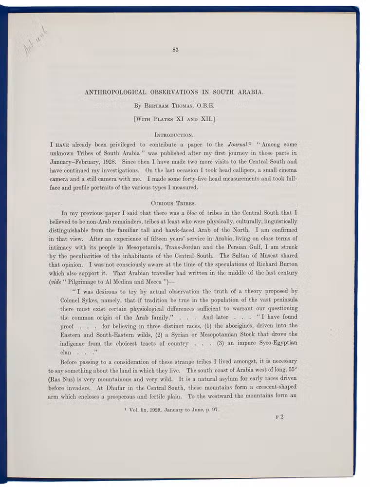 One of the important scholarly anthropological studies on the original inhabitants of the southern Arabic Peninsula/Jemen by the first documented Westerner to cross the Rub' al Khali (the sand desert encompassing most of the southern third of the Arabian Peninsula), Bertram Sidney Thomas (1892-1950). Thomas was an English diplomat and explorer who was also a scientist who practiced craniofacial anthropometry as also in this article.
