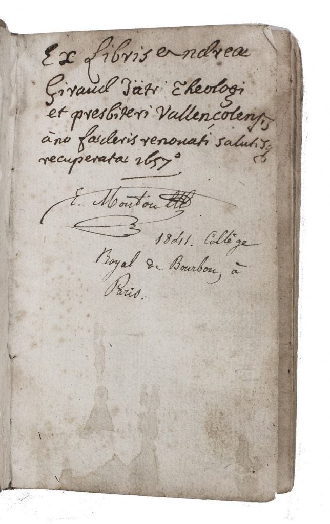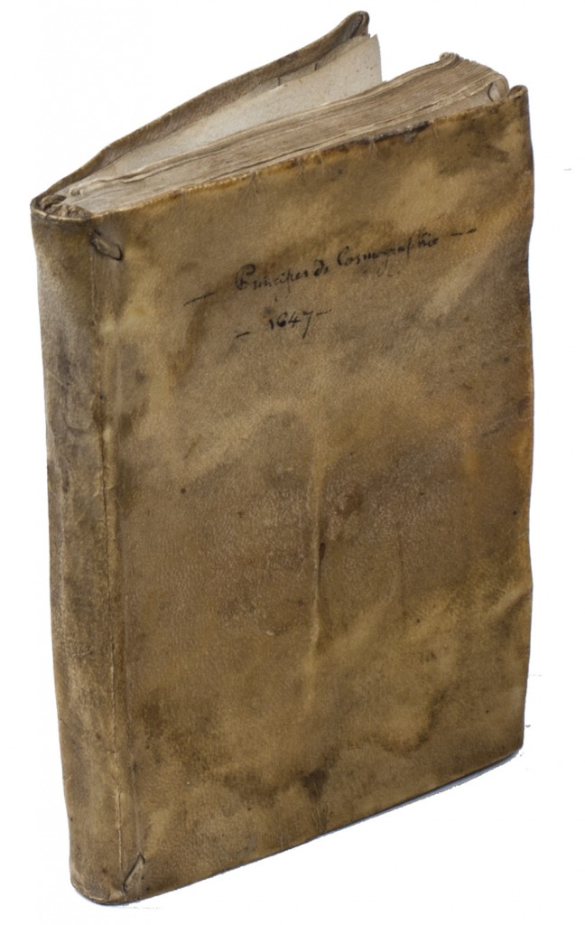 Paris, Jean Behourt, 1647. 12mo. With 2 woodcut illustrations in the text (a geocentric universe and a simple geometric figure). Contemporary limp sheepskin parchment. [8], "72" [=172] pp.